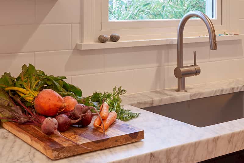 Your kitchen faucet gets a ton of use, so it must be able to take regular wear from handling and cleaning. Look for a faucet with a solid brass body, which lasts longer and stands up better to corrosion than other metals. (The body of the faucet is distinct from the metal finish, which can be chrome, stainless steel, bronze, etc.) Avoid faucets with cheap zinc-alloy bodies or, worse, plastic. They simply don’t last. Pick a faucet with a “lifetime” satin finish that resists water spots and fingerprints. Save the polished chrome for the powder room. Another factor is the valve. Opt for a super-reliable ceramic disc valve instead of a cartridge valve that will wear out quickly.