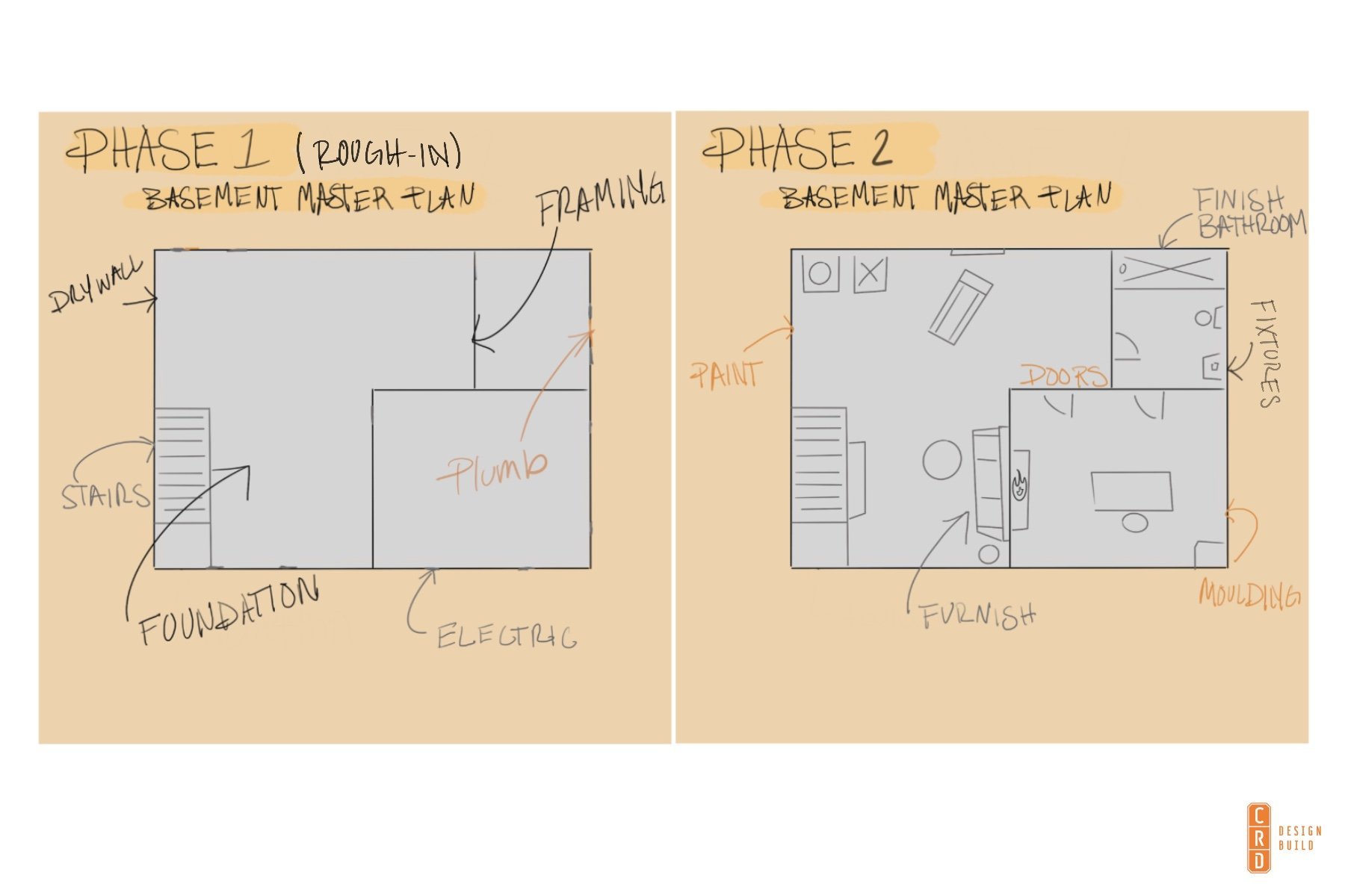 As I mentioned earlier, master planning is usually split into several phases. Ideally, phase one will include everything needed to make the other phases for the entire home more seamless. To help with this explanation, take a look at the graphic above. This master plan is just an example of a standard plan where the family wants to remodel their basement during the next couple of years. In phase one we will complete all foundation work, electrical, plumbing, and framing. In phase two we’ll add finishes and fixtures, and finish the stairs.