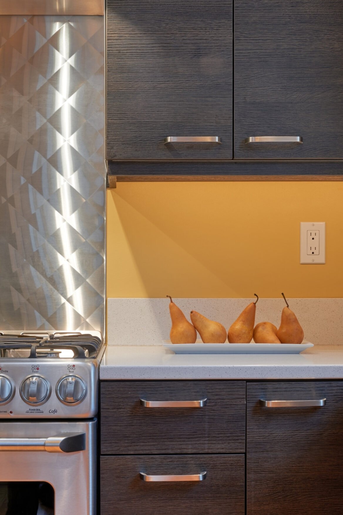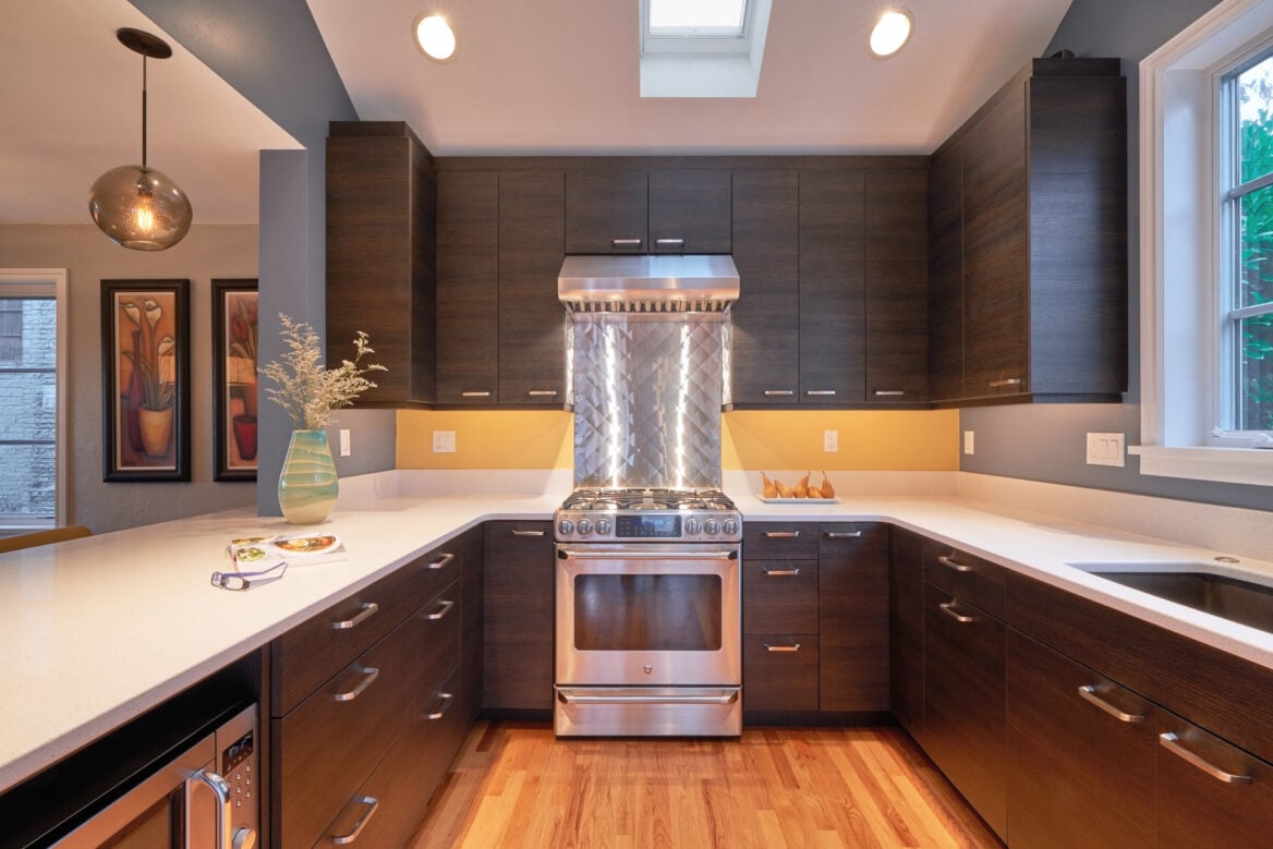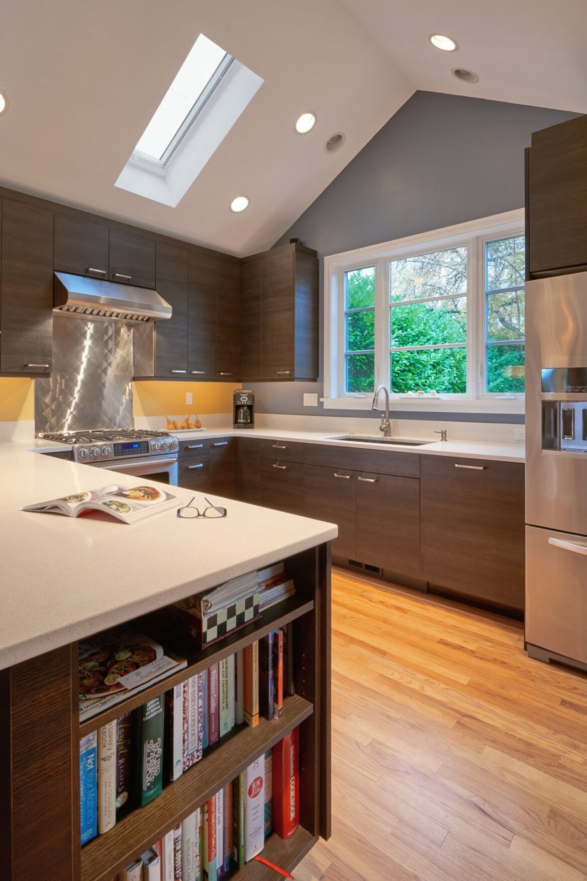 A Ballard home got a fresh, modern look when an addition was added on to the back of the home. The kitchen location moved to create a larger space and open connection to the dining and living room areas. We also incorporated an existing covered patio to work with a mudroom and new kitchen exterior door. The large kitchen peninsula was powered for use of laptops and charging phones, and a media nook and built-in bookshelf area fully personalize the space to suit the owners’ needs.