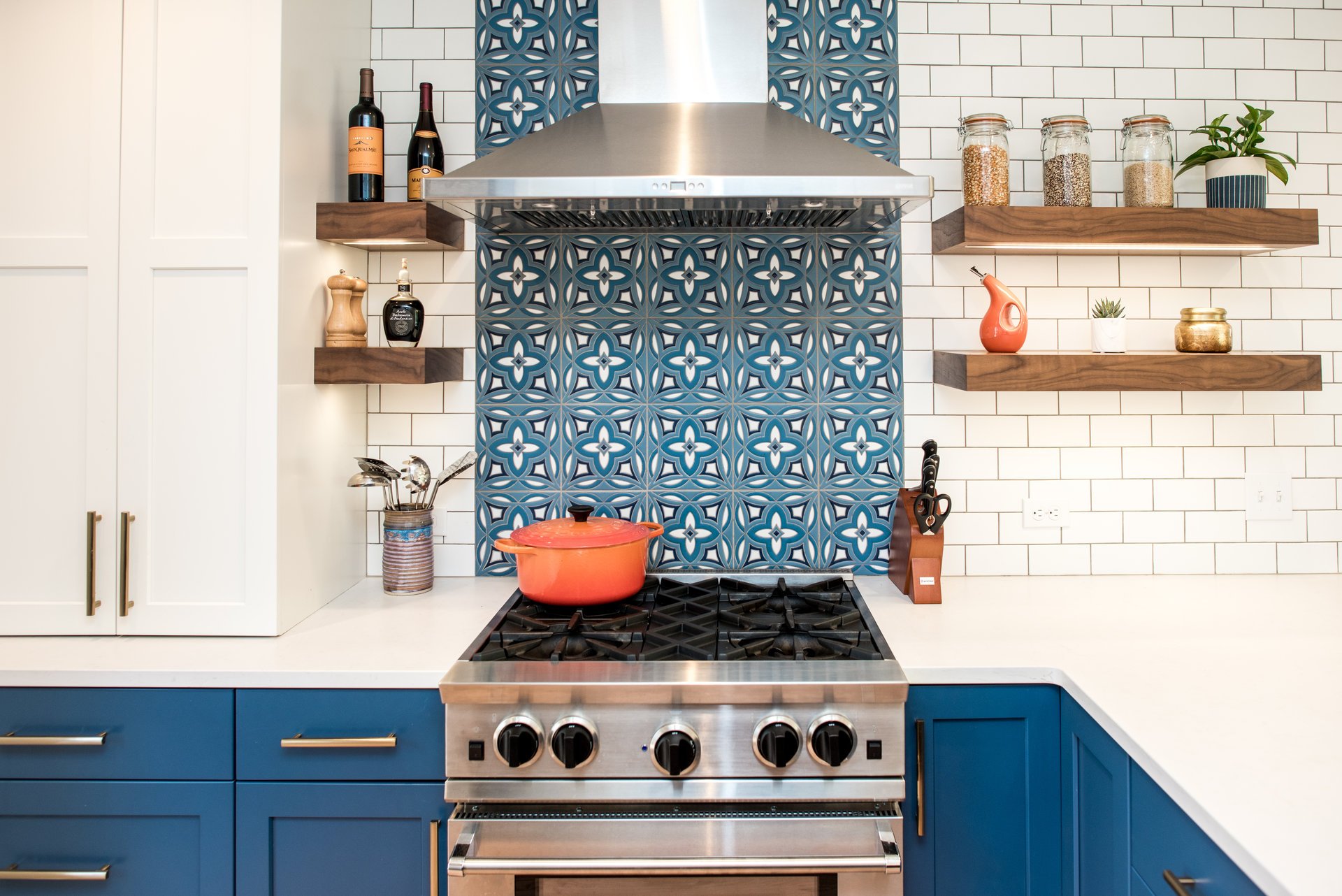 Our clients wanted their home to have a fresh new look that meshed with the needs of their busy family. With a few tweaks to the existing kitchen layout, we maximized counter and cabinet space, adding a deep pantry and breakfast nook cabinets, with built-in power and small appliance storage. A mix of matte white and custom-made Fireclay tiles brighten up the kitchen, as does a new full-light exterior door. The hard-working honed quartz countertops were installed a bit higher to be ergonomically correct for our clients, who are on the taller side.