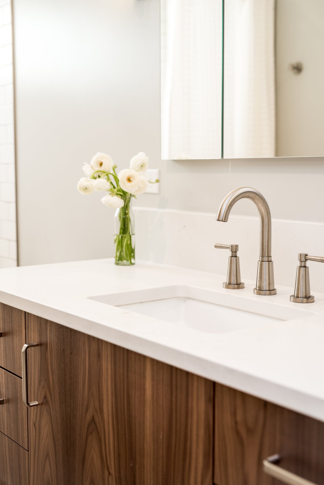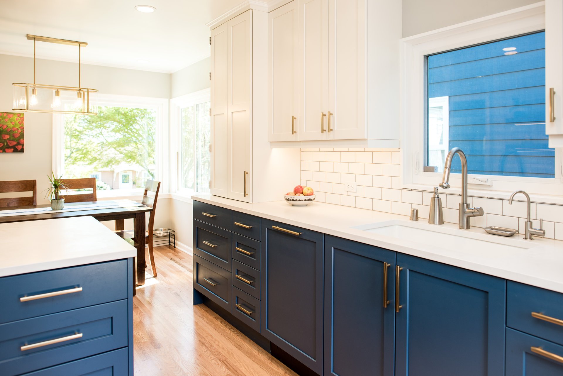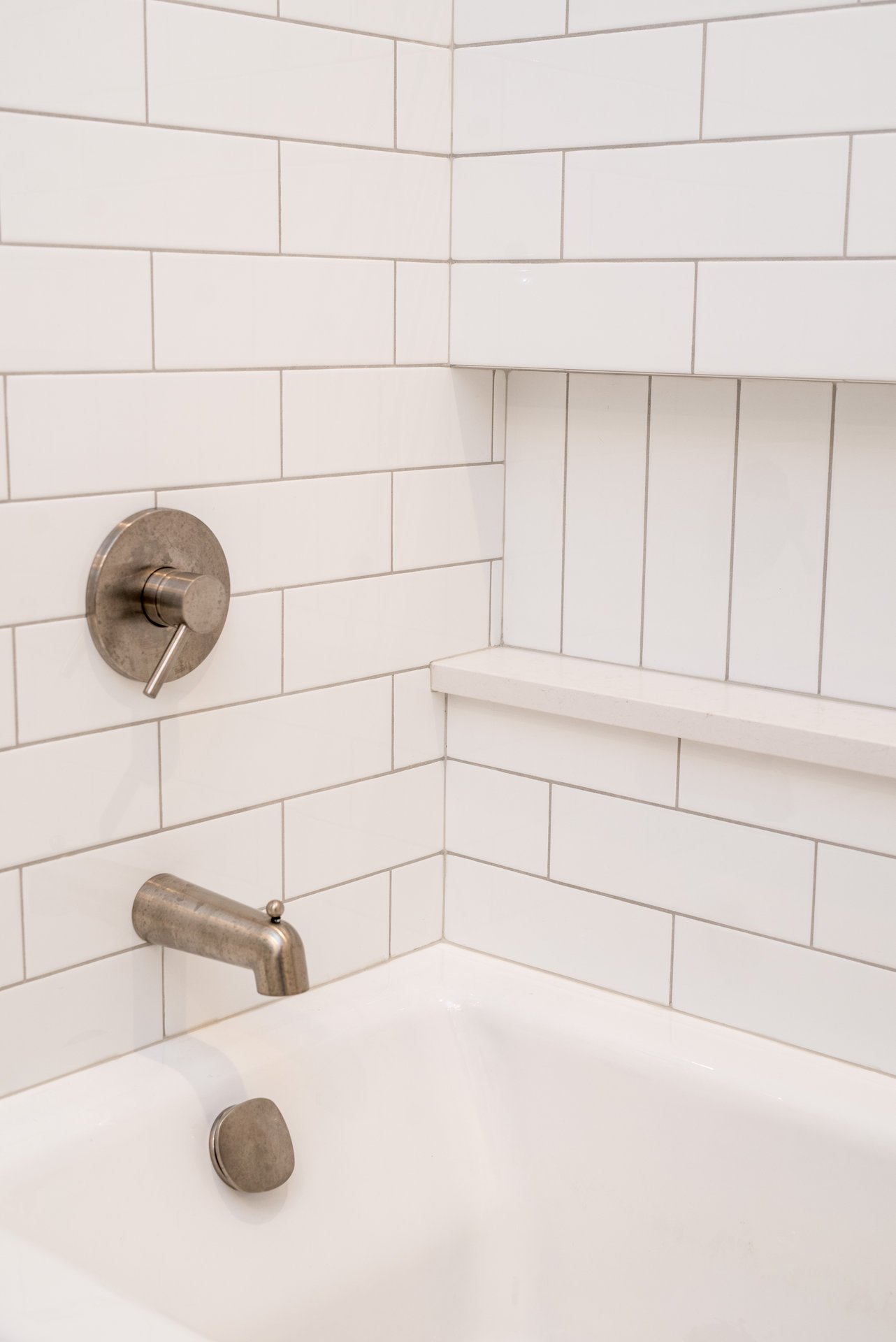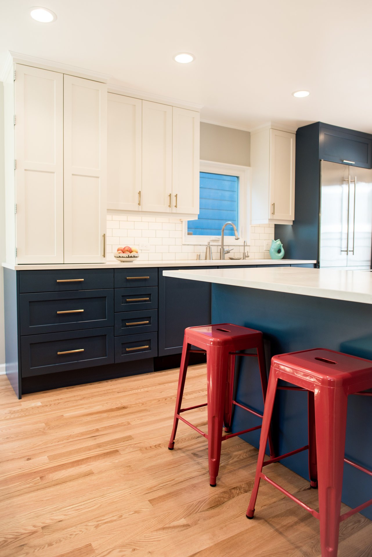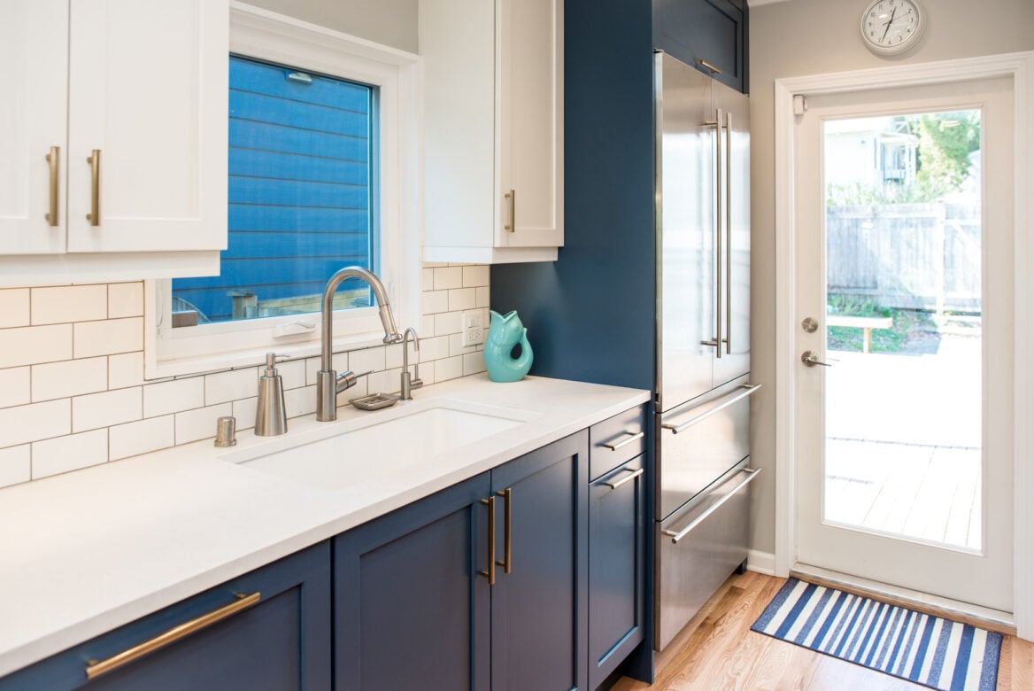 Our clients wanted their home to have a fresh new look that meshed with the needs of their busy family. With a few tweaks to the existing kitchen layout, we maximized counter and cabinet space, adding a deep pantry and breakfast nook cabinets, with built-in power and small appliance storage. A mix of matte white and custom-made Fireclay tiles brighten up the kitchen, as does a new full-light exterior door. The hard-working honed quartz countertops were installed a bit higher to be ergonomically correct for our clients, who are on the taller side.