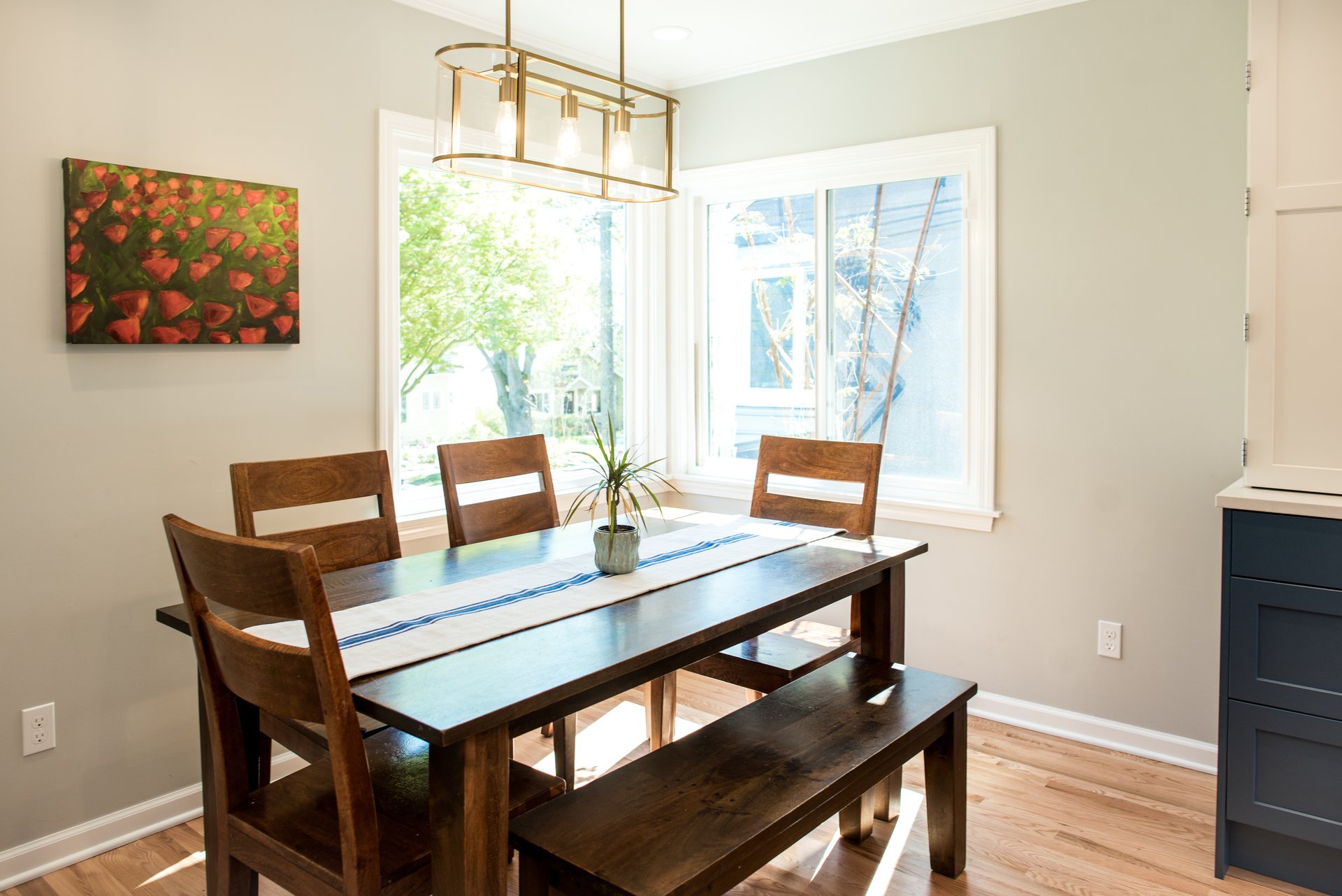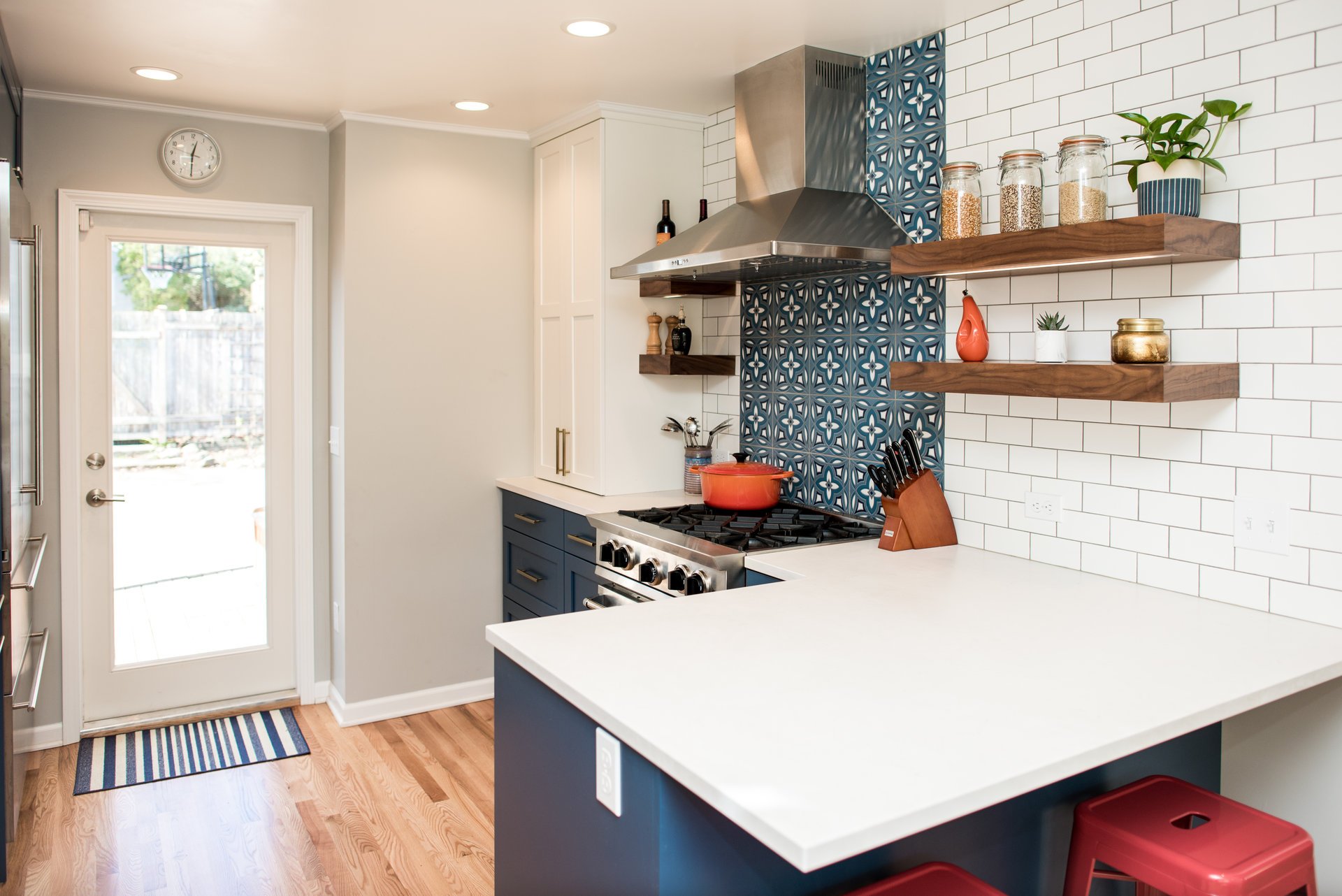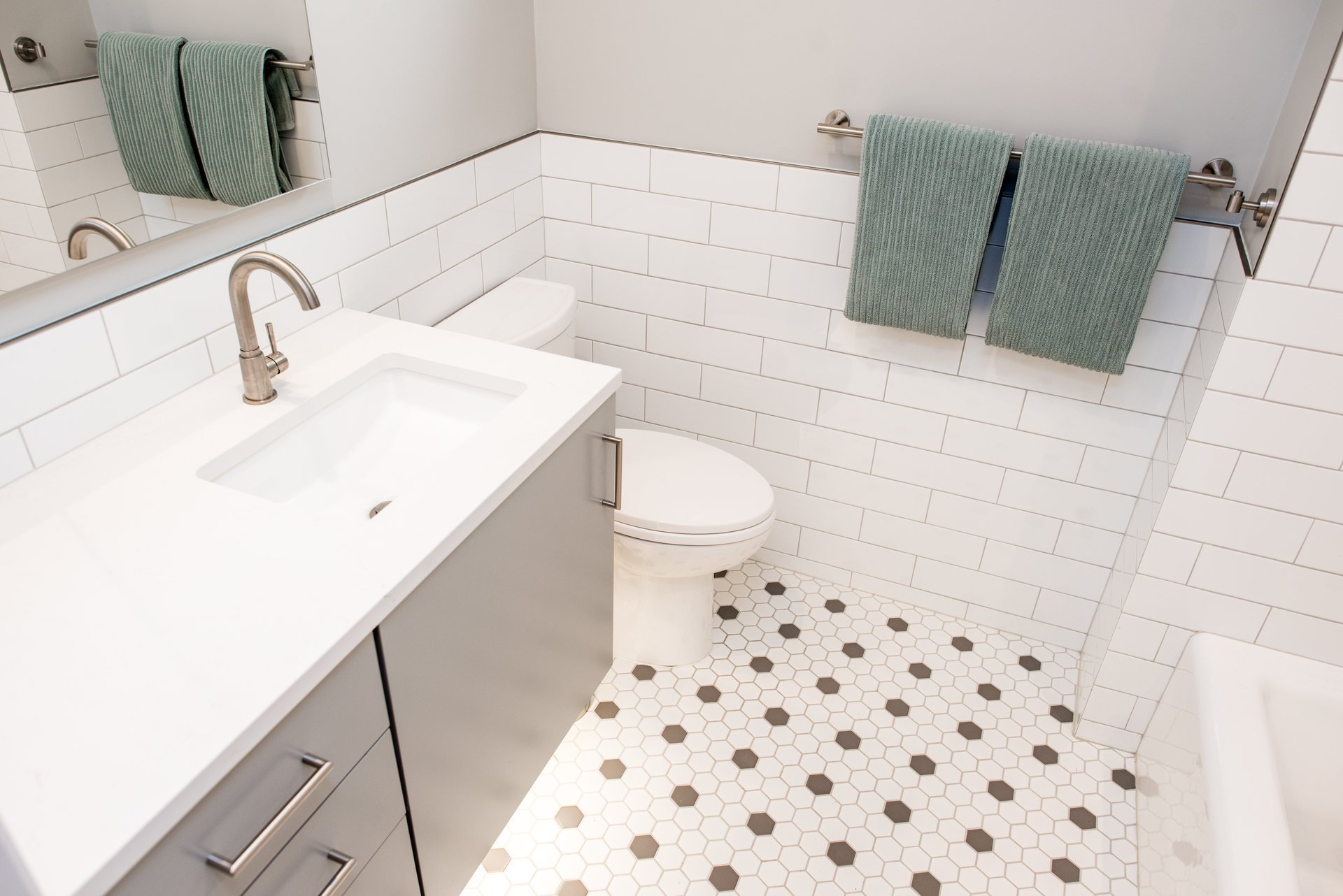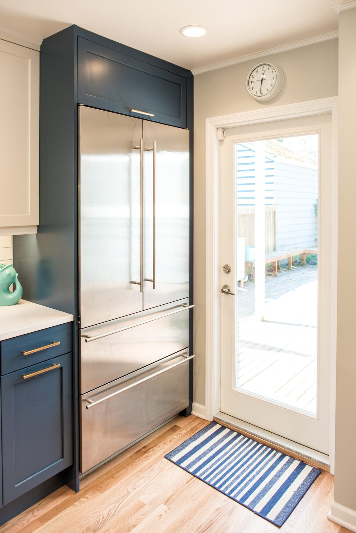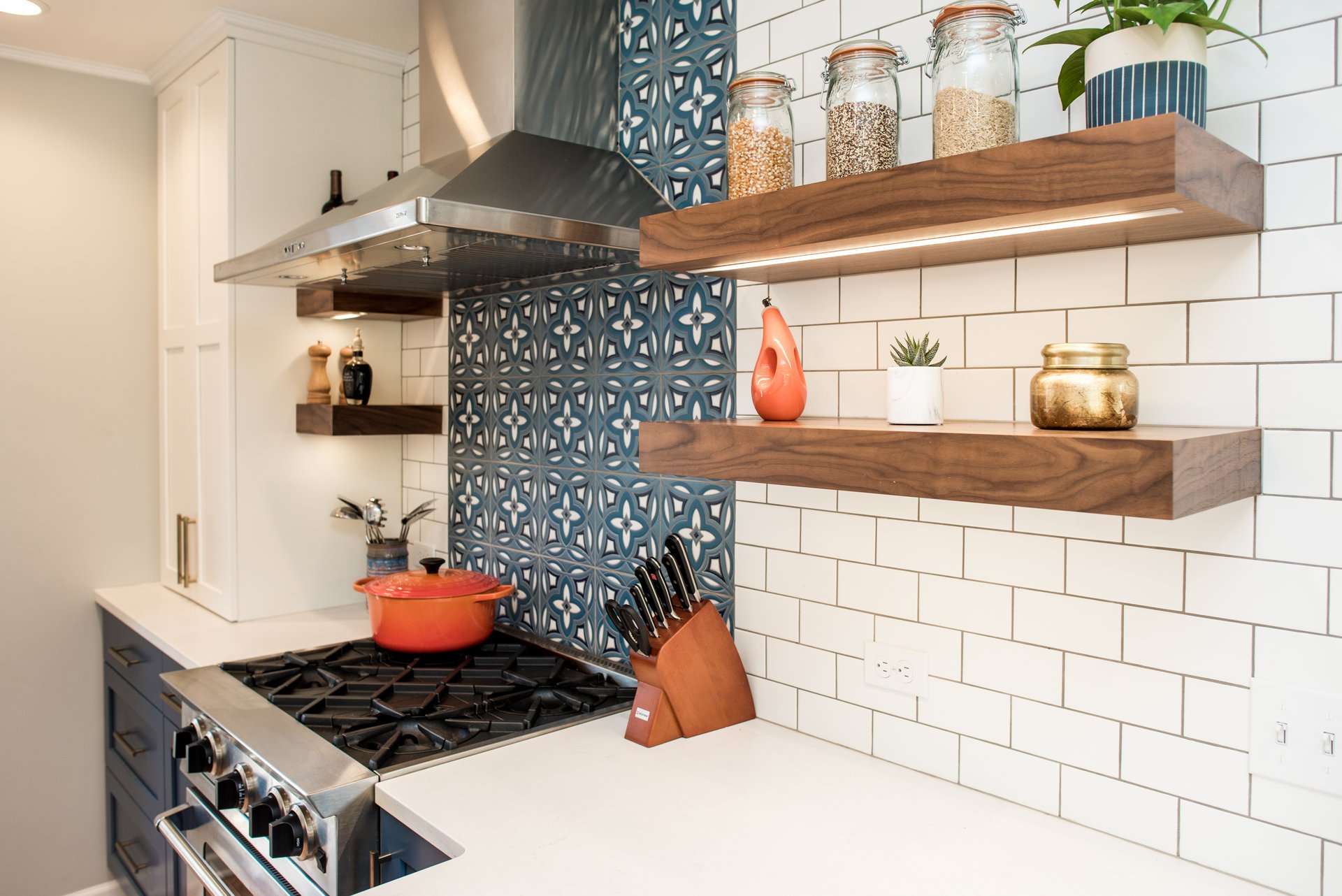 Our clients wanted their home to have a fresh new look that meshed with the needs of their busy family. With a few tweaks to the existing kitchen layout, we maximized counter and cabinet space, adding a deep pantry and breakfast nook cabinets, with built-in power and small appliance storage. A mix of matte white and custom-made Fireclay tiles brighten up the kitchen, as does a new full-light exterior door. The hard-working honed quartz countertops were installed a bit higher to be ergonomically correct for our clients, who are on the taller side.