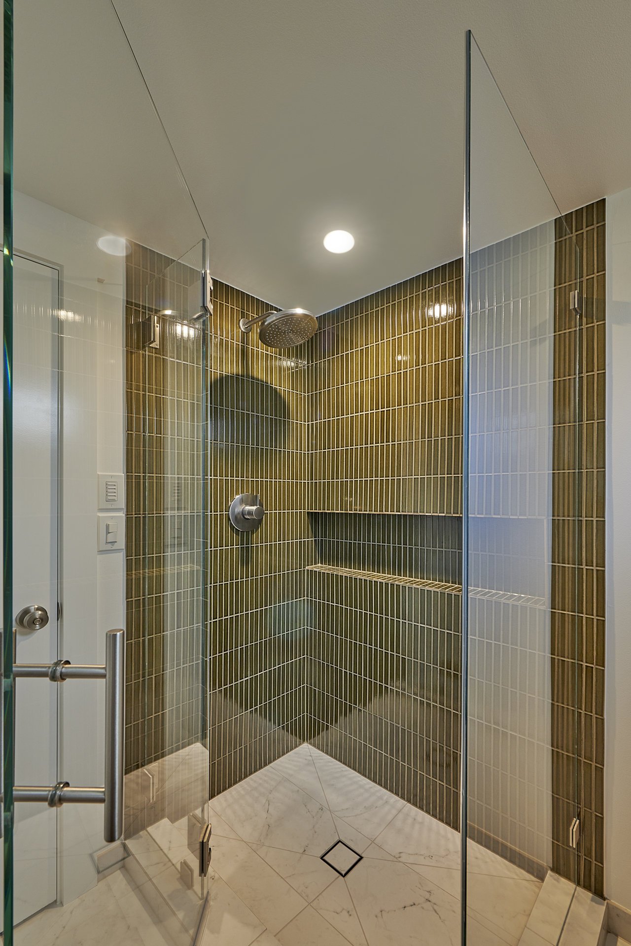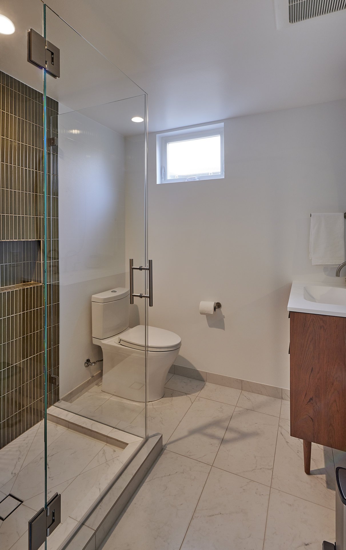 We successfully transformed this once cramped and outdated bathroom into a stunning, highly functional space that our clients now adore. Our skilled team worked to revitalize and modernize the entire bathroom, leaving it not only visually appealing but also incredibly practical by removing the confining shower walls that had long plagued the space. To create an illusion of spaciousness, we introduced a sleek shower glass wall and door, instantly opening up the room and flooding it with natural light. The selection of vibrant green shower tile walls and the white marble-look tile floor played a pivotal role in enhancing the room’s perceived size and elevating its overall luxury. This palette shift from subdued beige tones to these refreshing and timeless choices has breathed new life into the bathroom, leaving it as a testament to our commitment to quality and aesthetics.