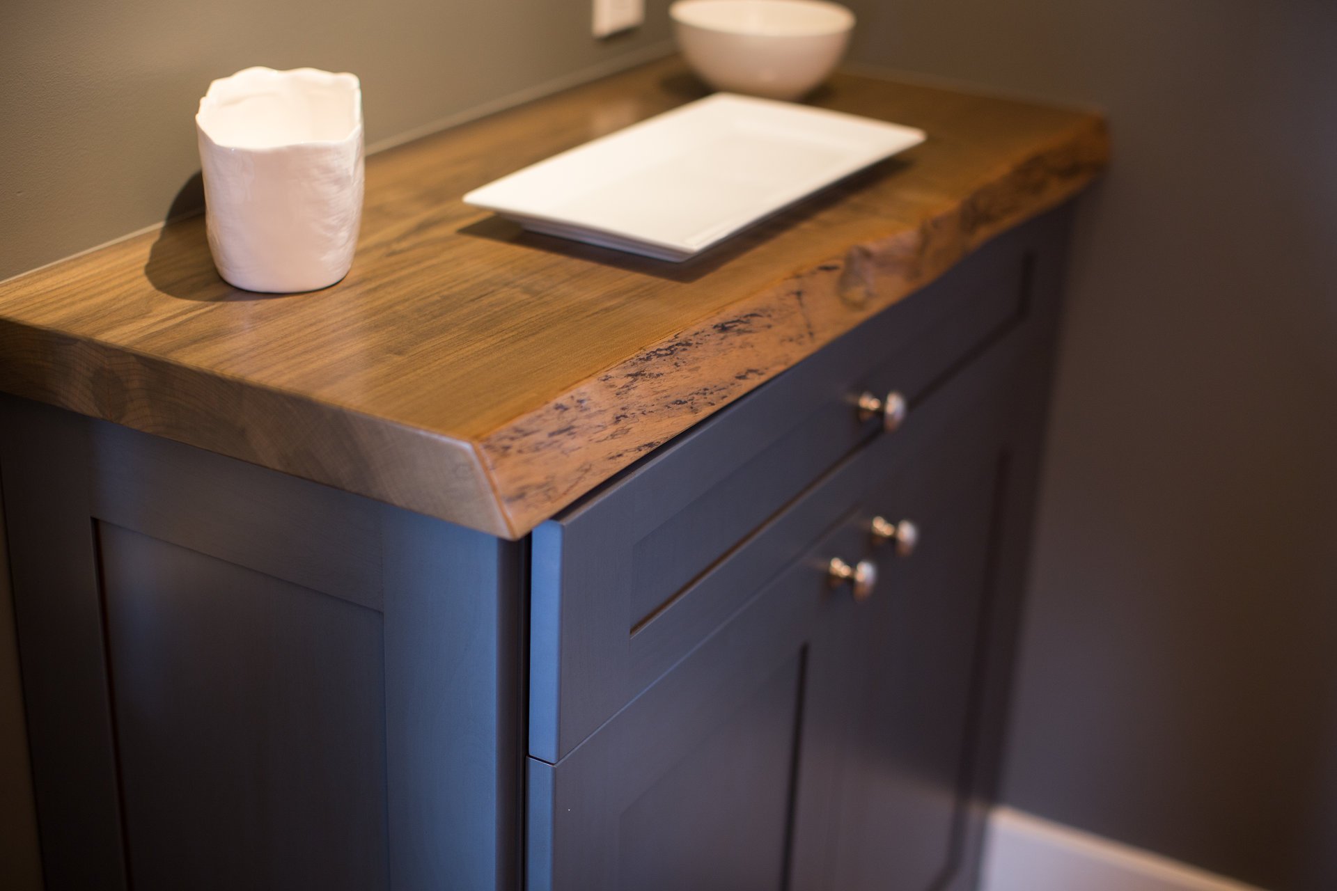 A young family in North Capitol Hill was in need of a serious update for their kitchen, pantry, and three baths. The result is a contemporary, fresh, comfortable space that seamlessly integrates with the rest of the home. A sliding barn door was installed in the new master bedroom with mirrors on both sides for function and to add a feeling of space and light. In the kitchen, custom buffet cabinets with reclaimed live-edge wood countertops were added as well as a special niche for dog dishes.