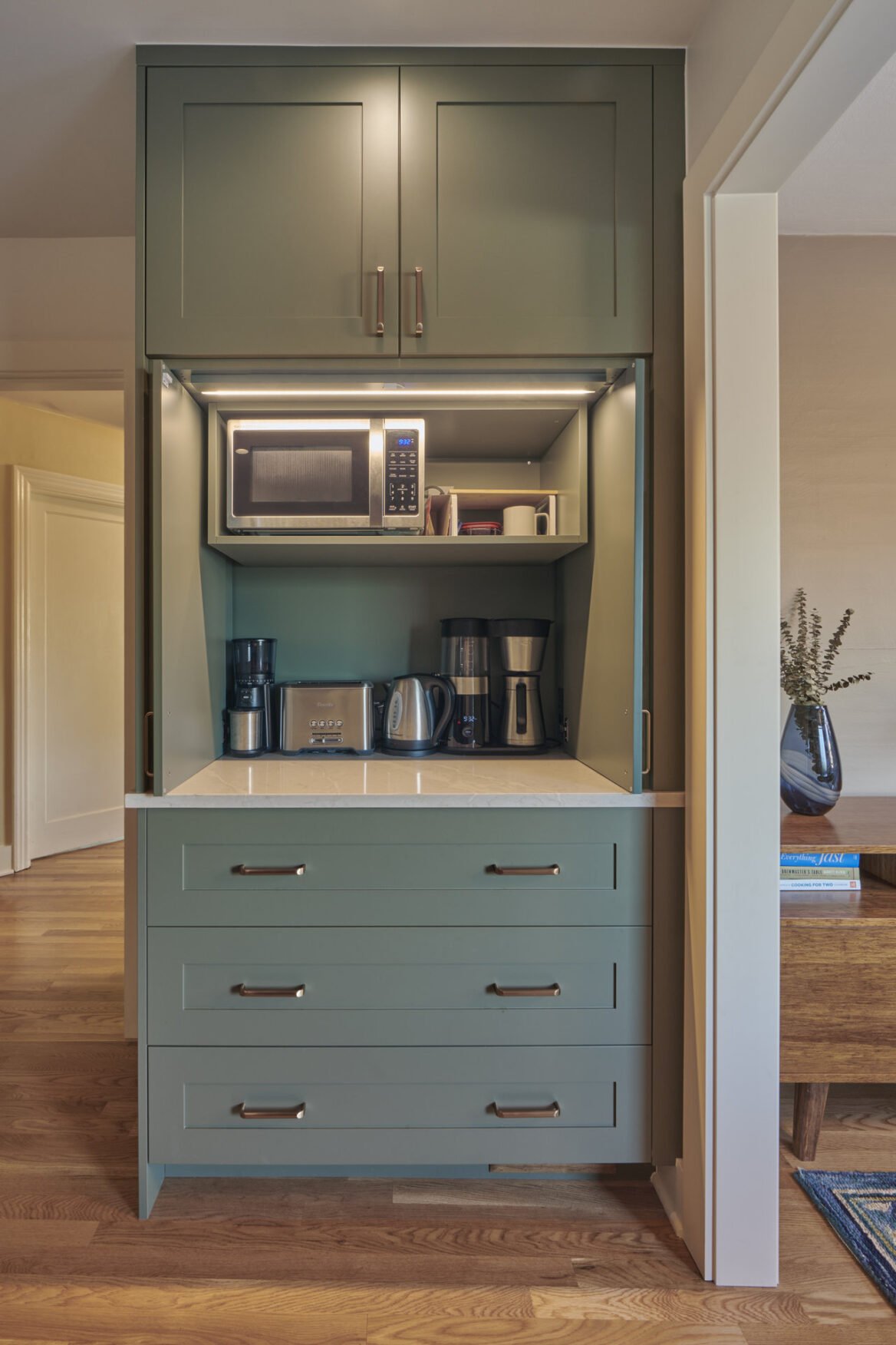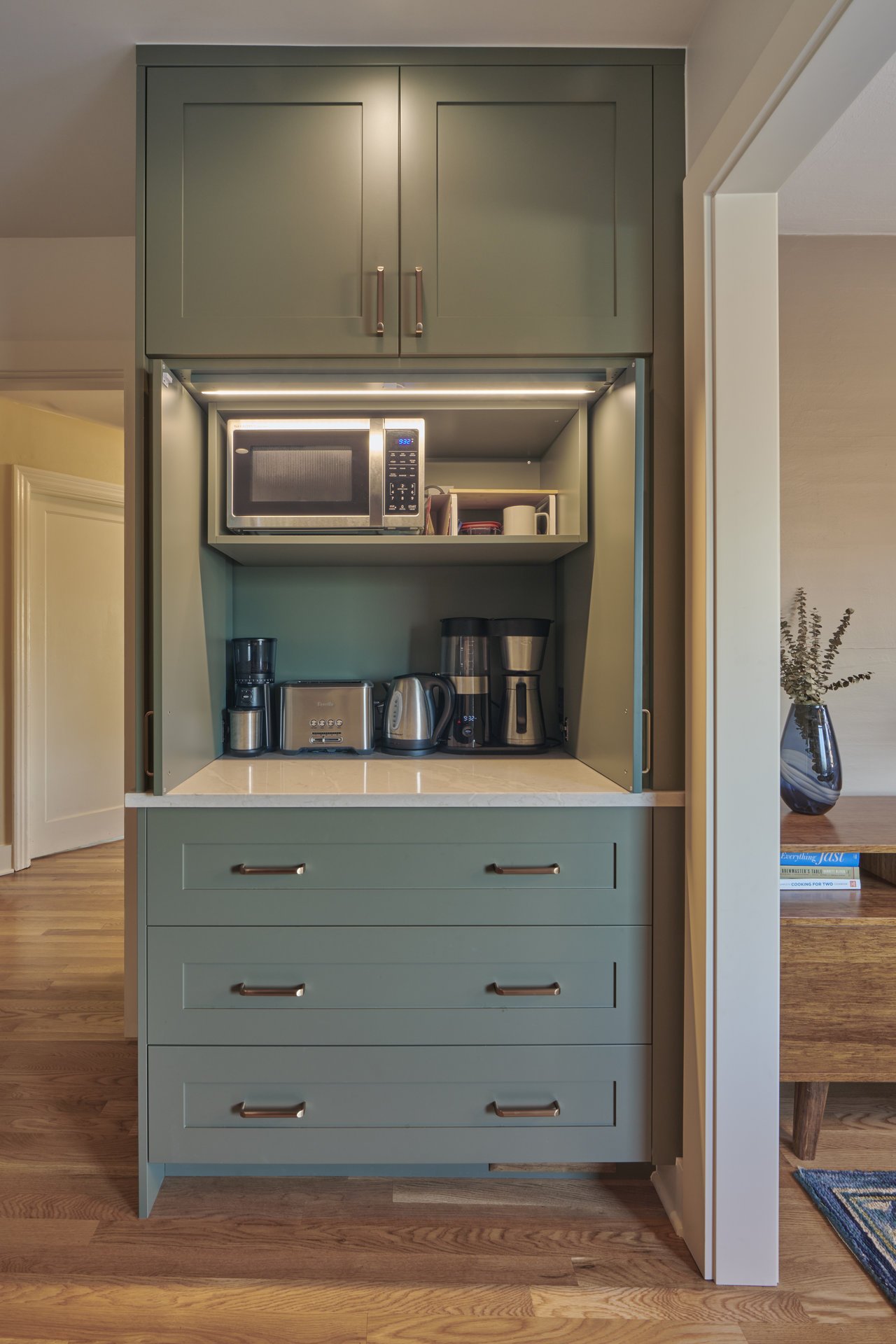 A custom hood was crafted to bring in warm wood elements that flow throughout the kitchen, adding cohesion and character. The beloved coffee bar also received an upgrade, with cabinet doors that neatly conceal appliances when not in use. Unique teal cabinetry paired with rich wood finishes breathes new life into the space, transforming it into a stylish, practical area for cooking and gathering.