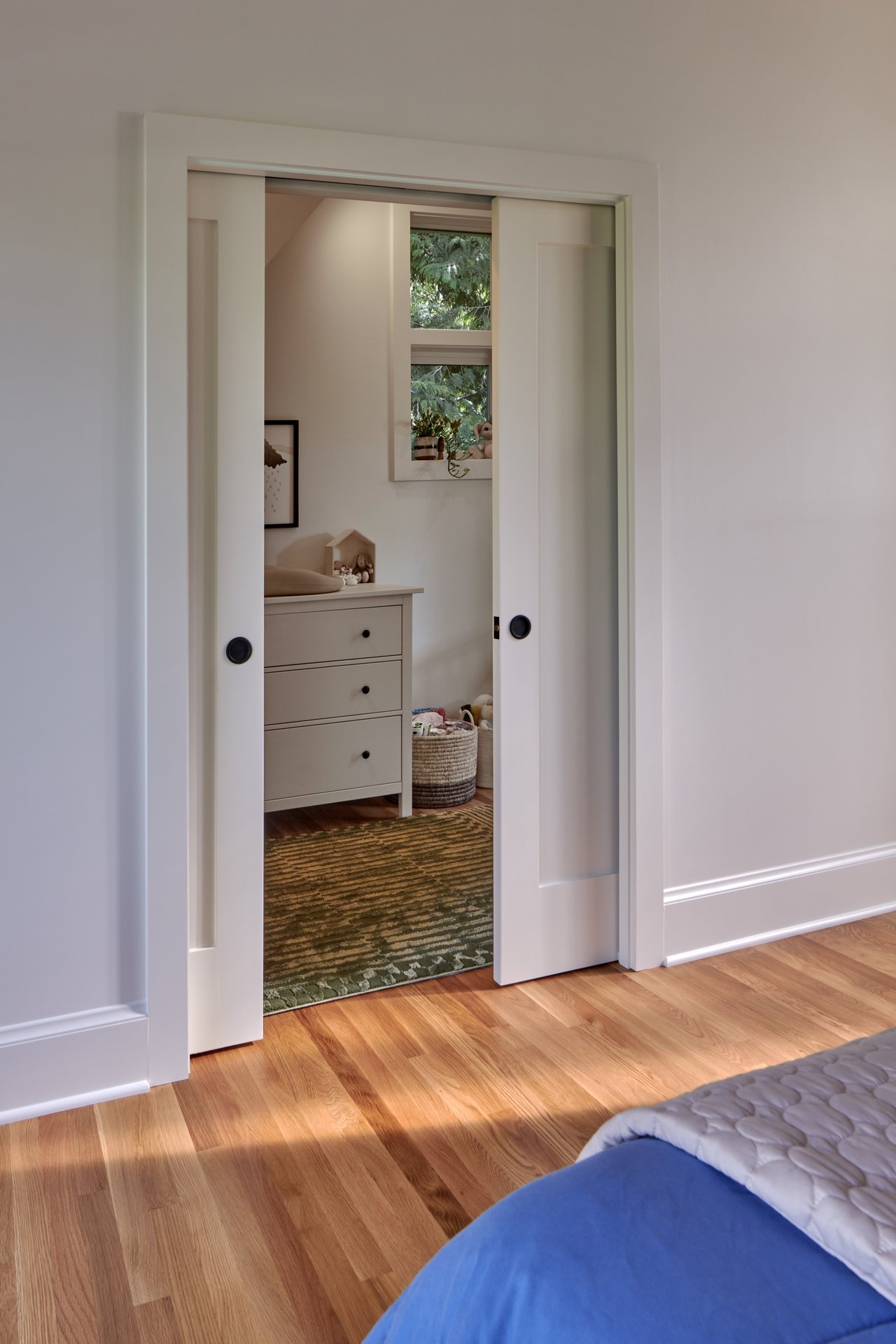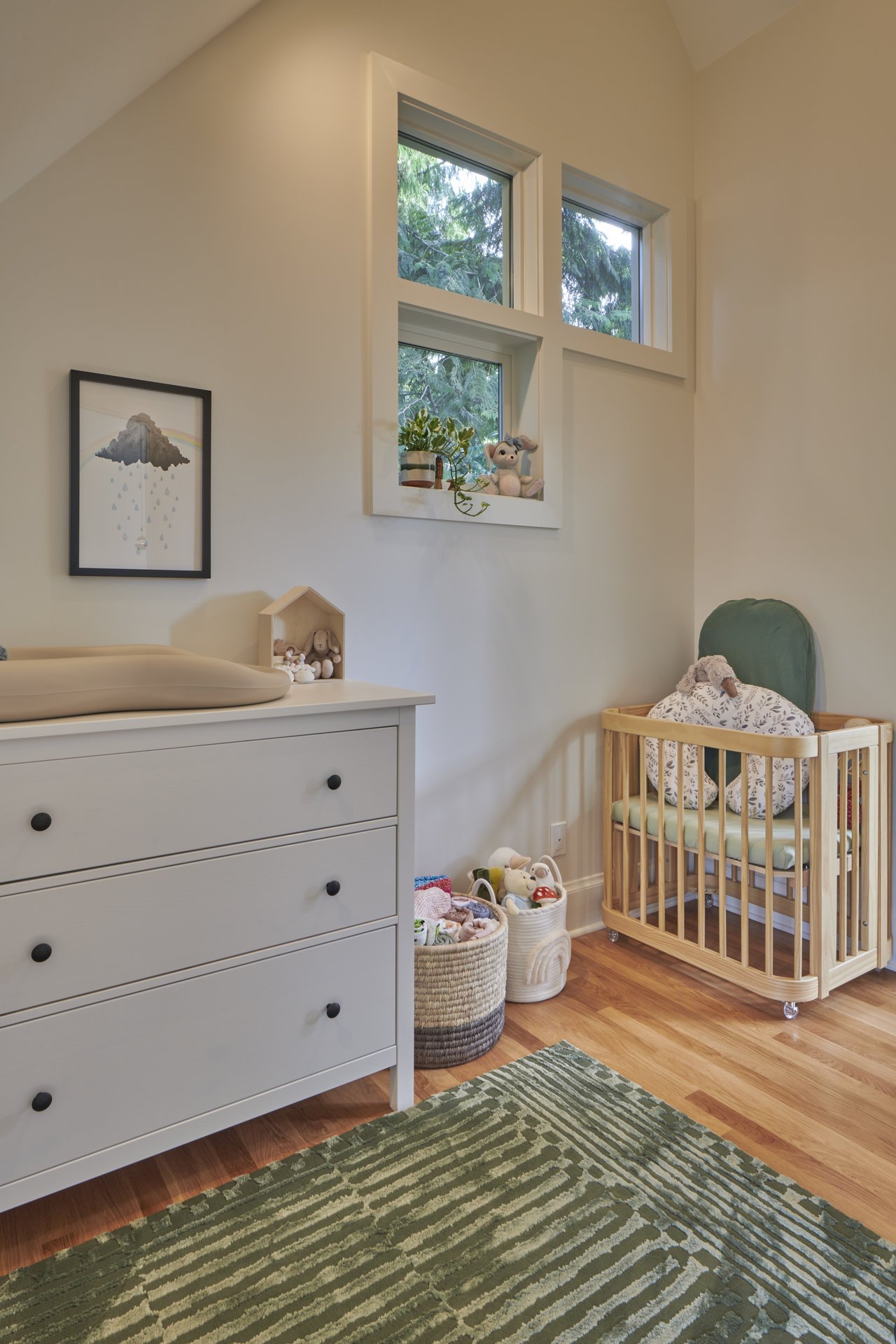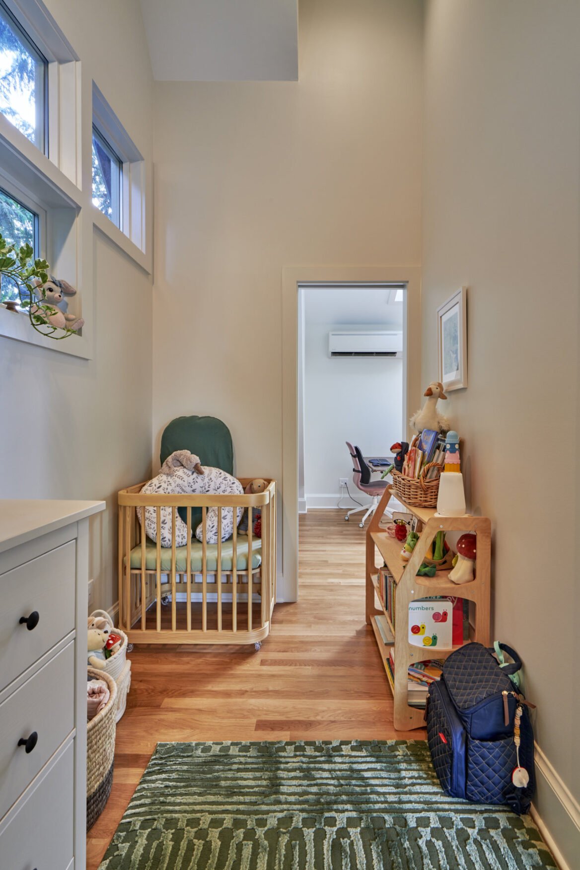 Lastly, the top level has been transformed into the ideal primary suite, featuring a nursery, bathroom, walk-in closet, and a dedicated desk area. This renovation was a necessity for the growing family, as they required additional space for their new baby. The functionality of this space received a substantial overhaul, especially considering that the toilet was originally positioned in the middle of the primary suite.