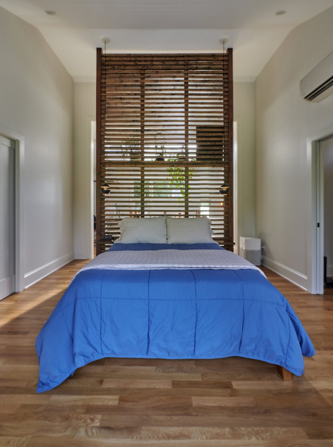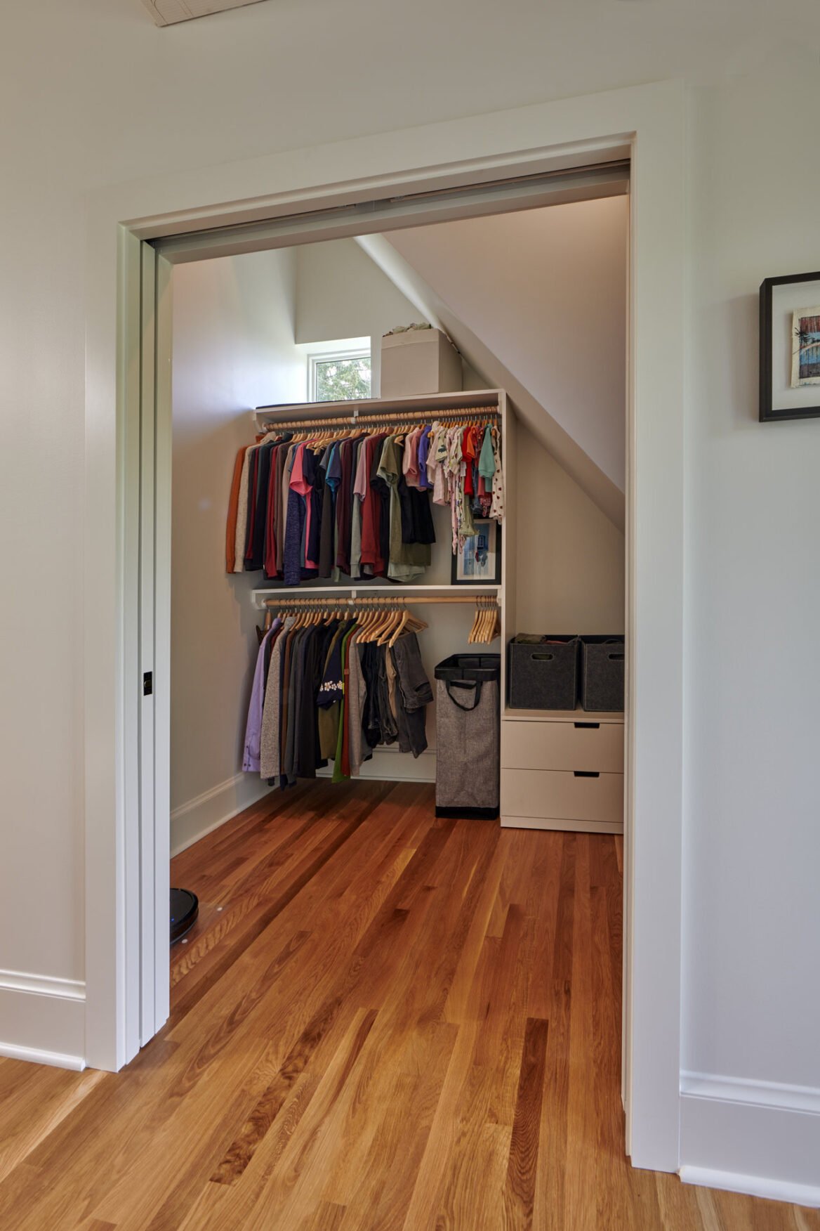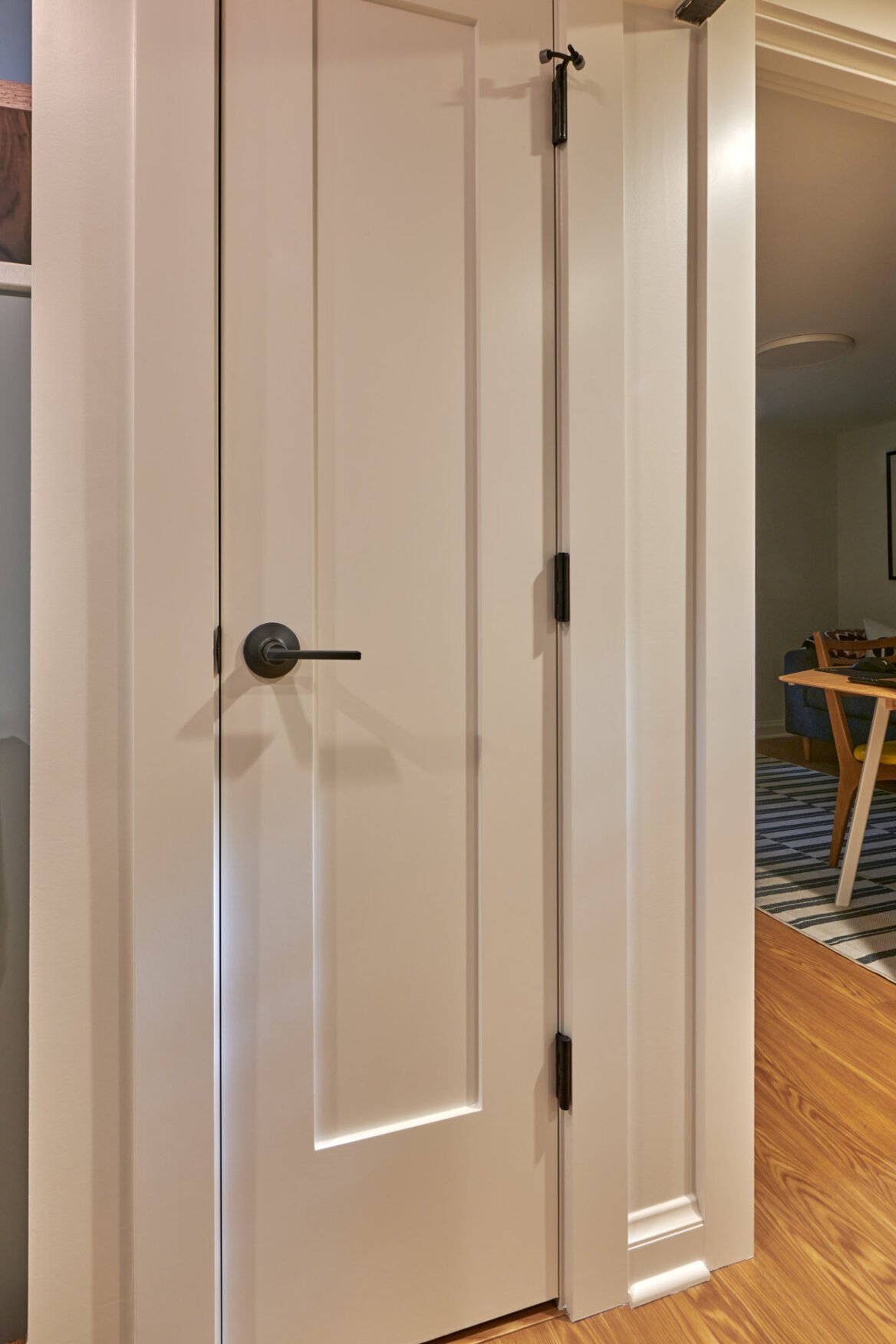 Lastly, the top level has been transformed into the ideal primary suite, featuring a nursery, bathroom, walk-in closet, and a dedicated desk area. This renovation was a necessity for the growing family, as they required additional space for their new baby. The functionality of this space received a substantial overhaul, especially considering that the toilet was originally positioned in the middle of the primary suite.