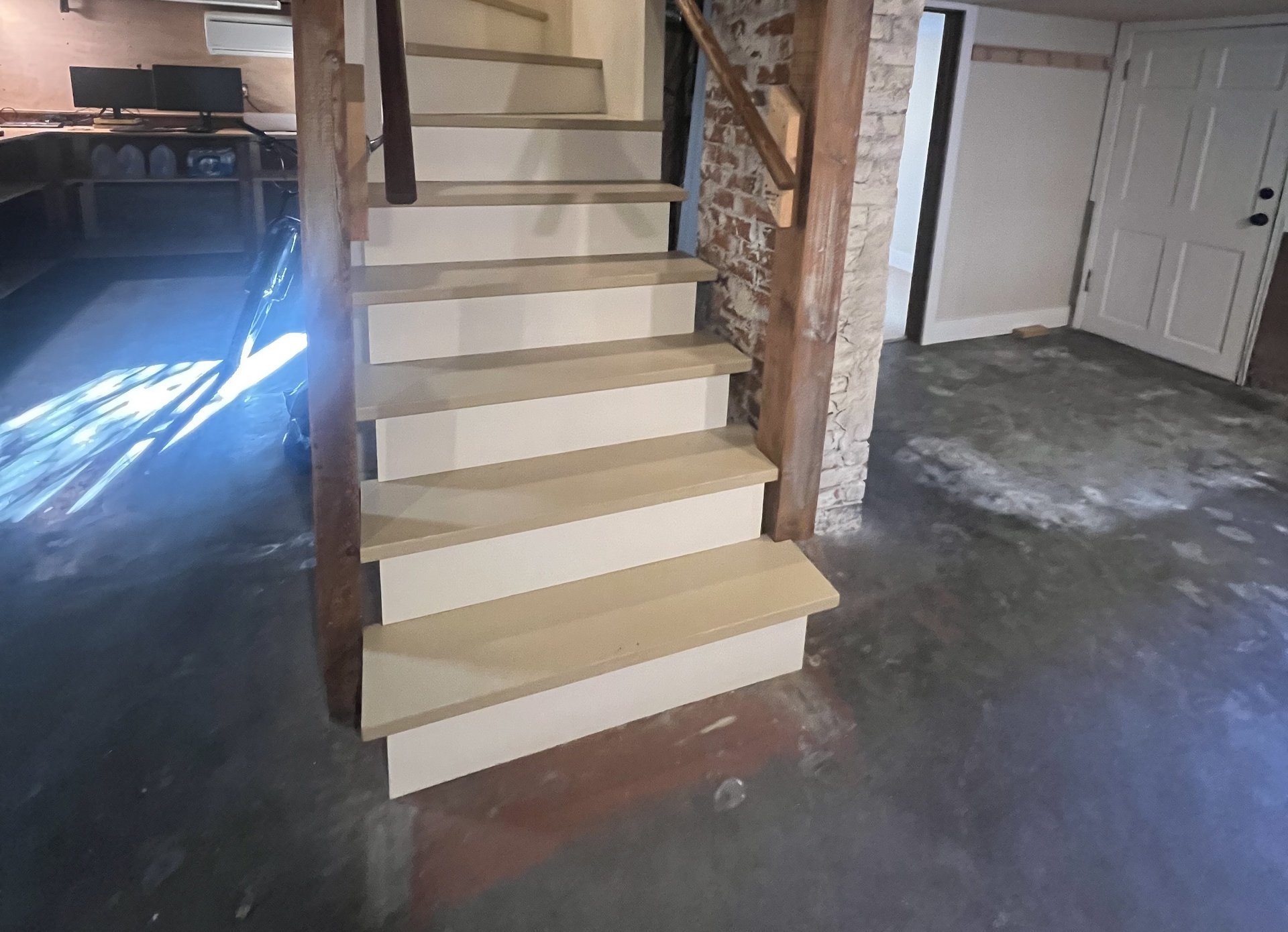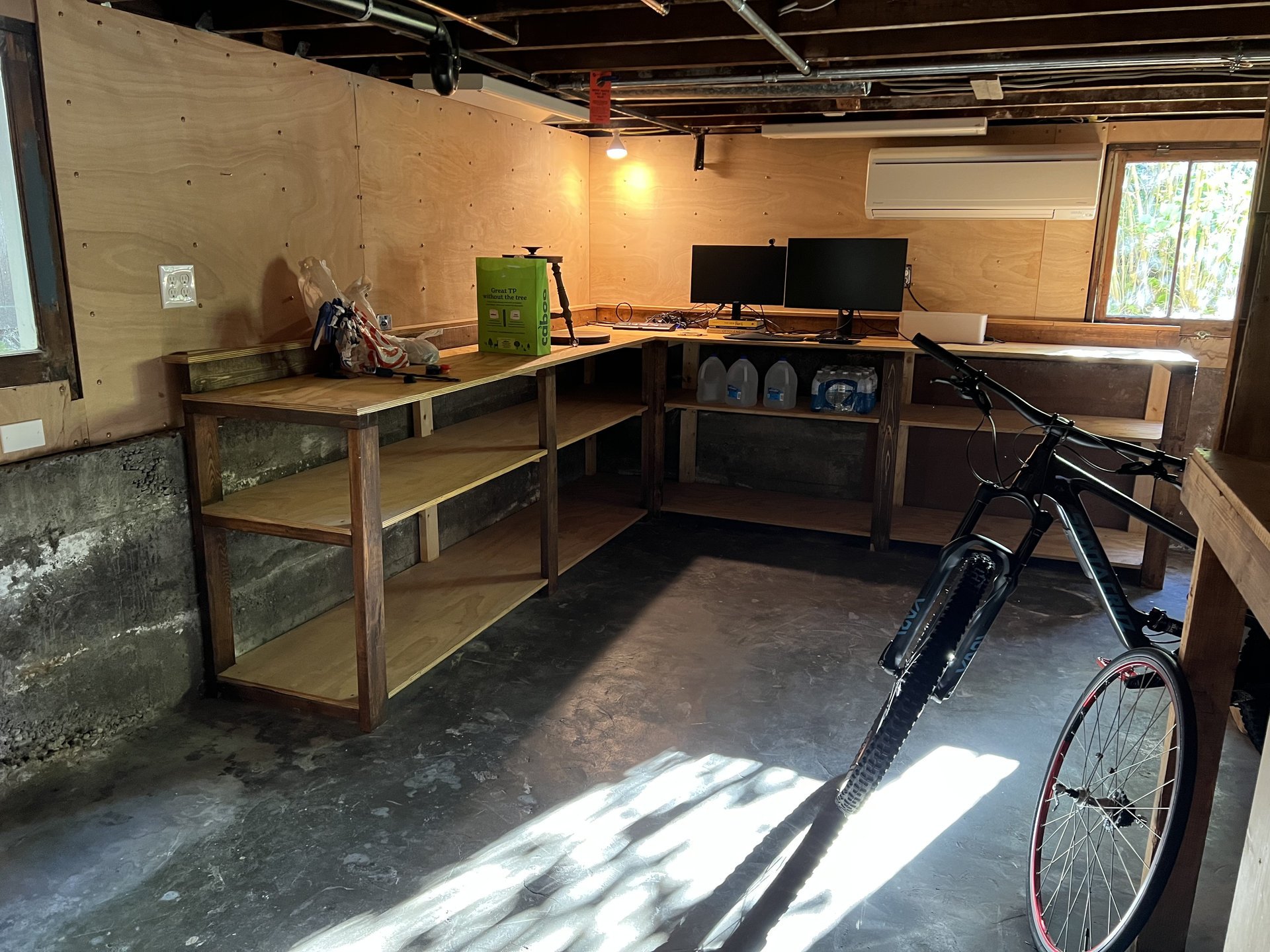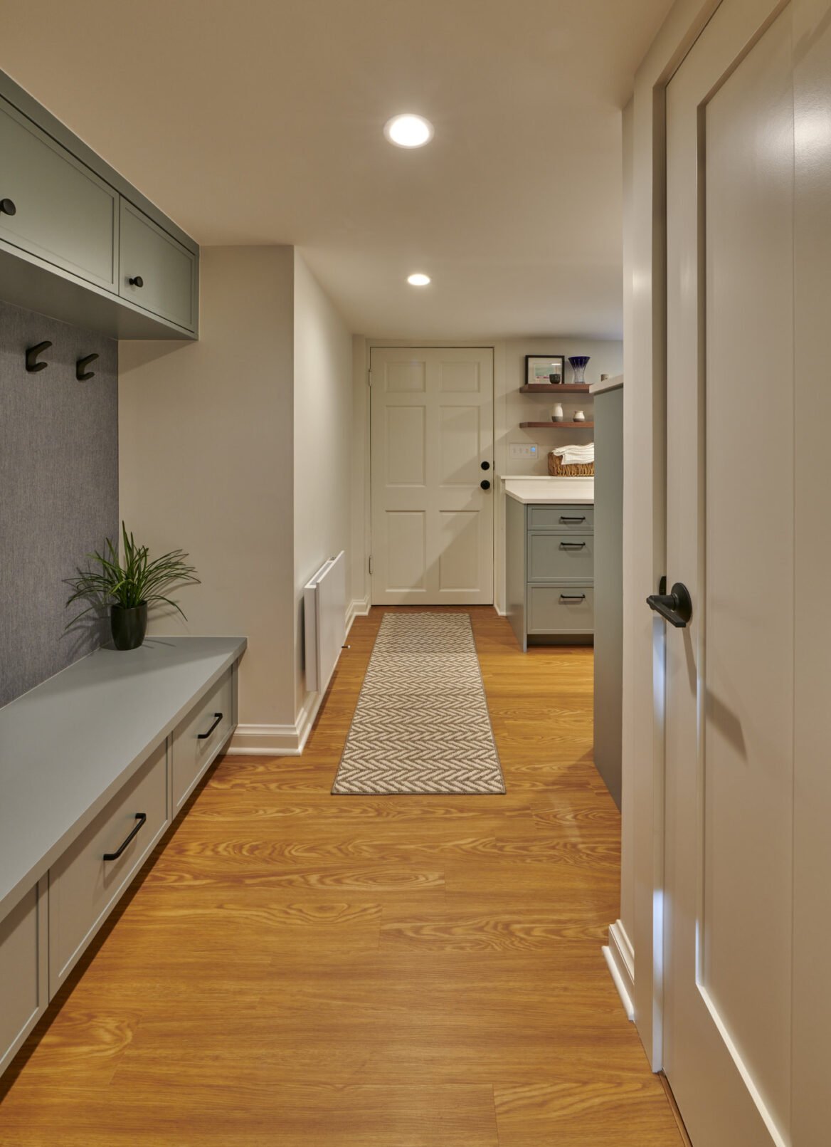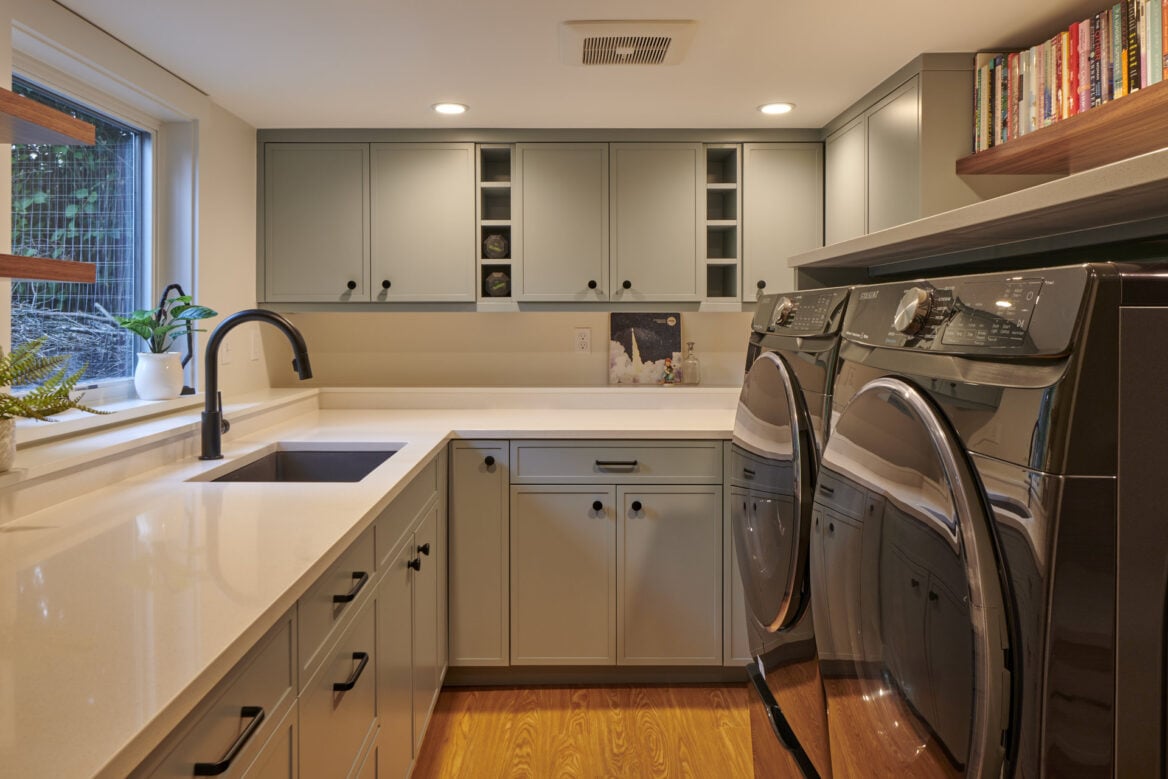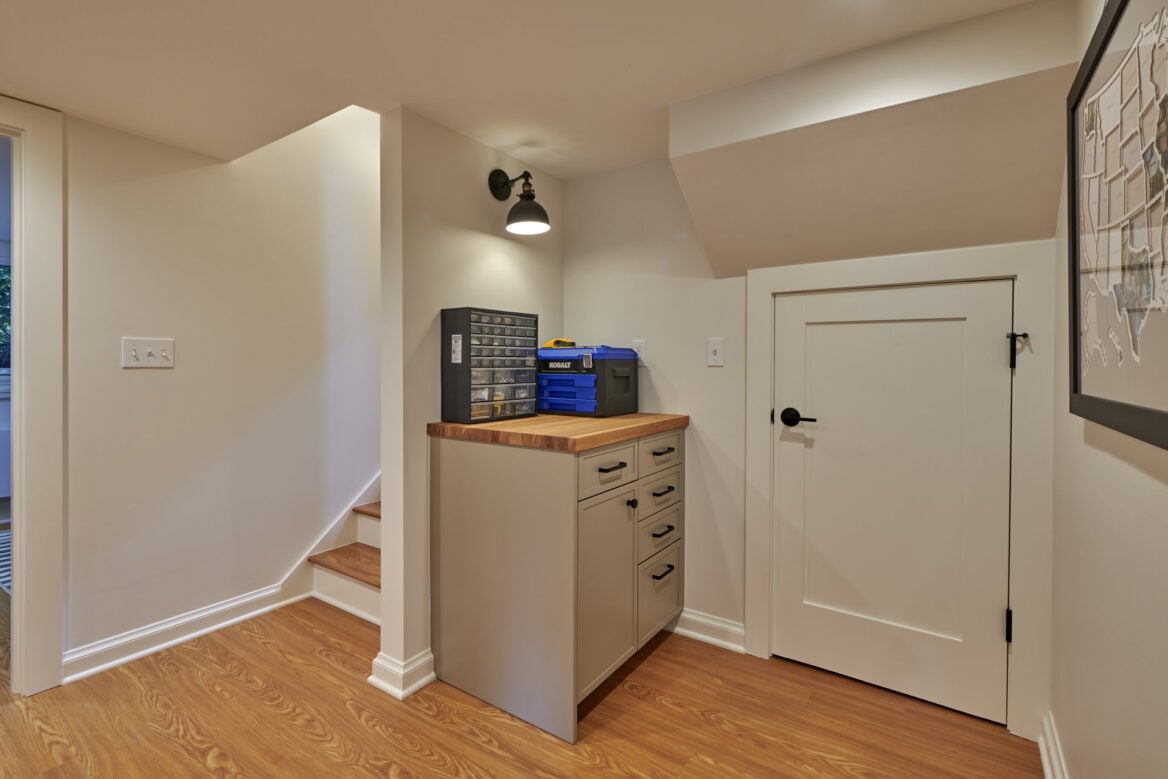 The photo journey begins in the basement, where we introduced a full suite of amenities, including a full bathroom, bedroom, office, laundry/storage area, and a compact tool storage area. Our meticulous planning allowed us to maximize the utilization of this space, providing the homeowners with ample storage options and versatile usage possibilities. Among our favorite additions was a specialized closet for their wetsuits, complete with a drainage system.