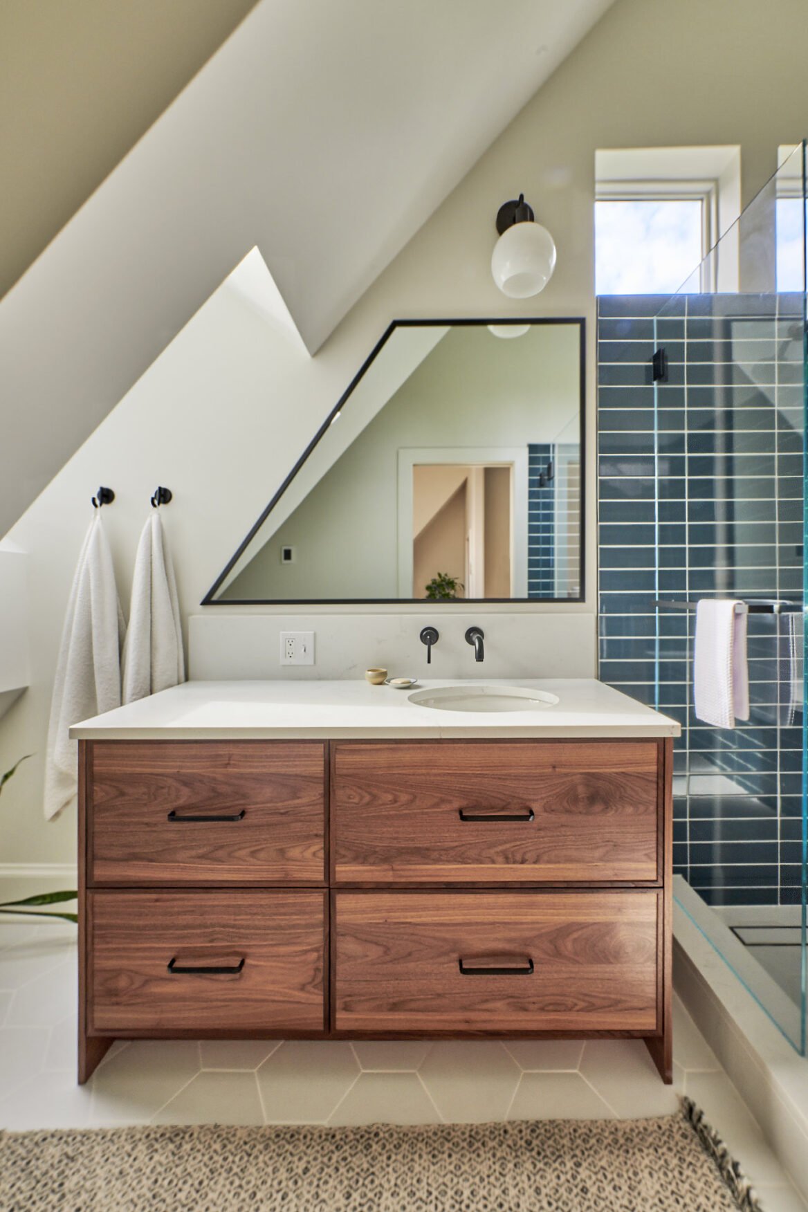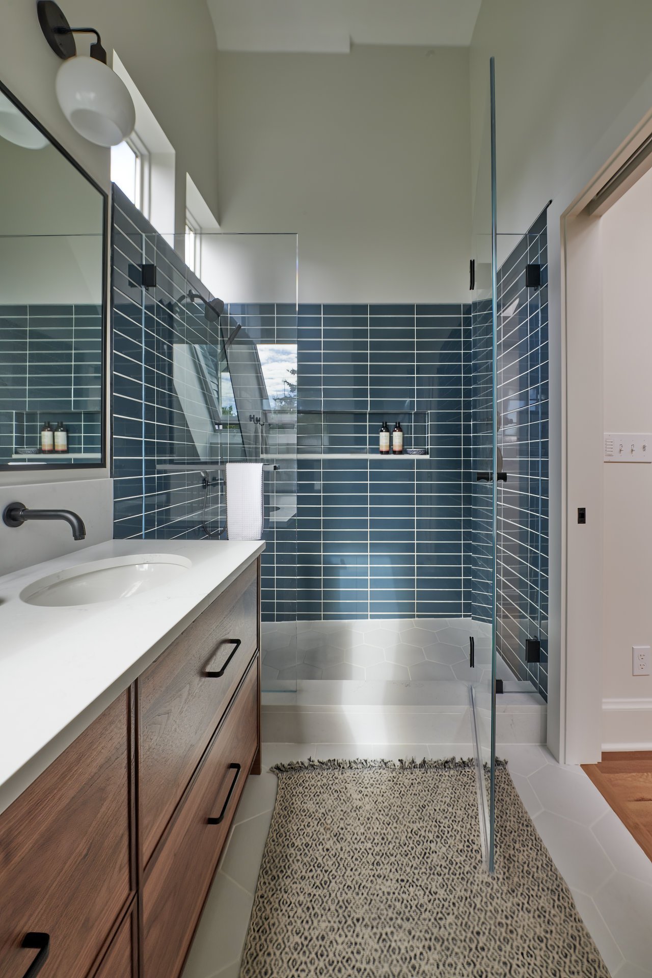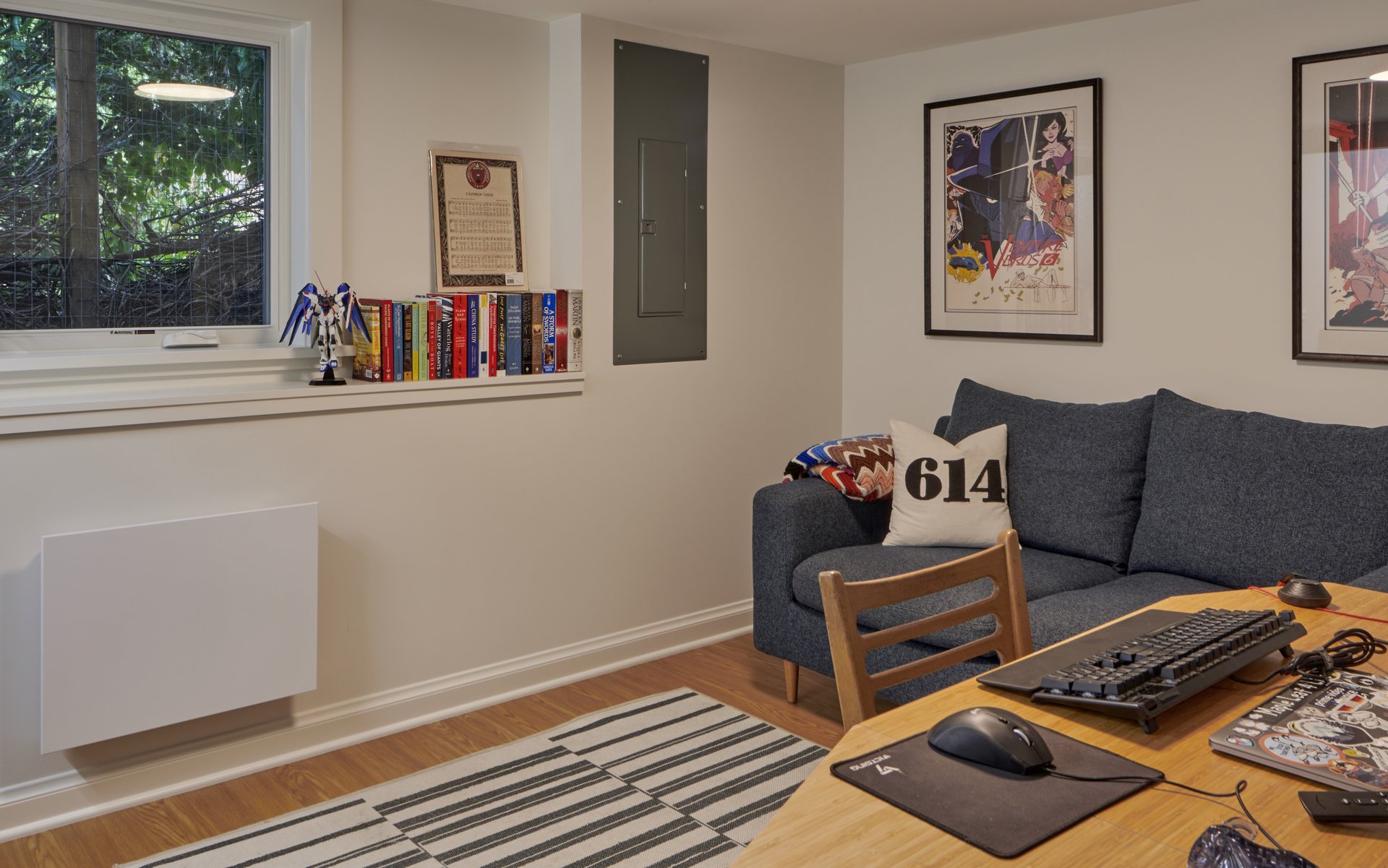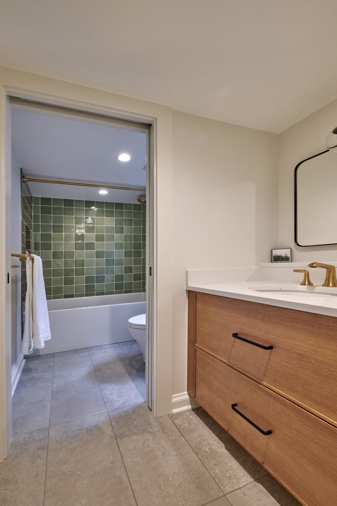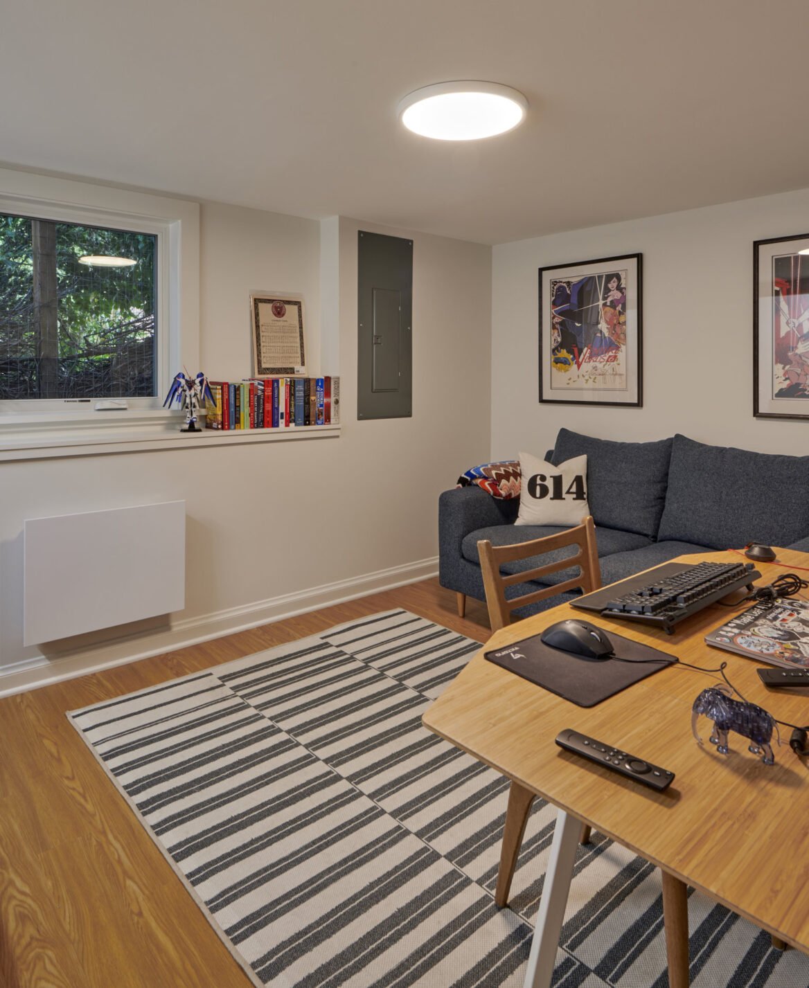 The photo journey begins in the basement, where we introduced a full suite of amenities, including a full bathroom, bedroom, office, laundry/storage area, and a compact tool storage area. Our meticulous planning allowed us to maximize the utilization of this space, providing the homeowners with ample storage options and versatile usage possibilities. Among our favorite additions was a specialized closet for their wetsuits, complete with a drainage system.