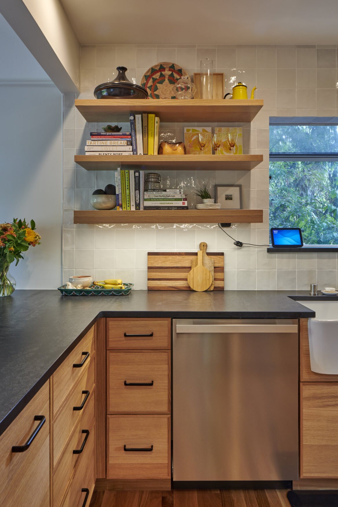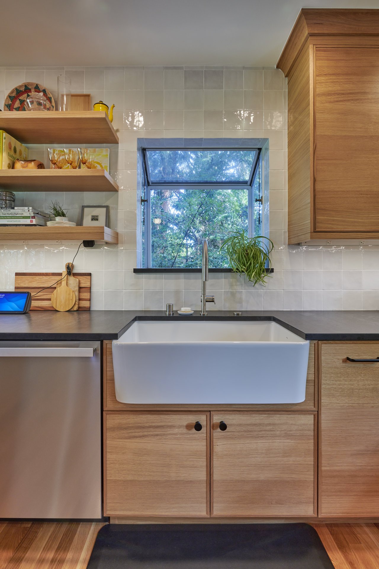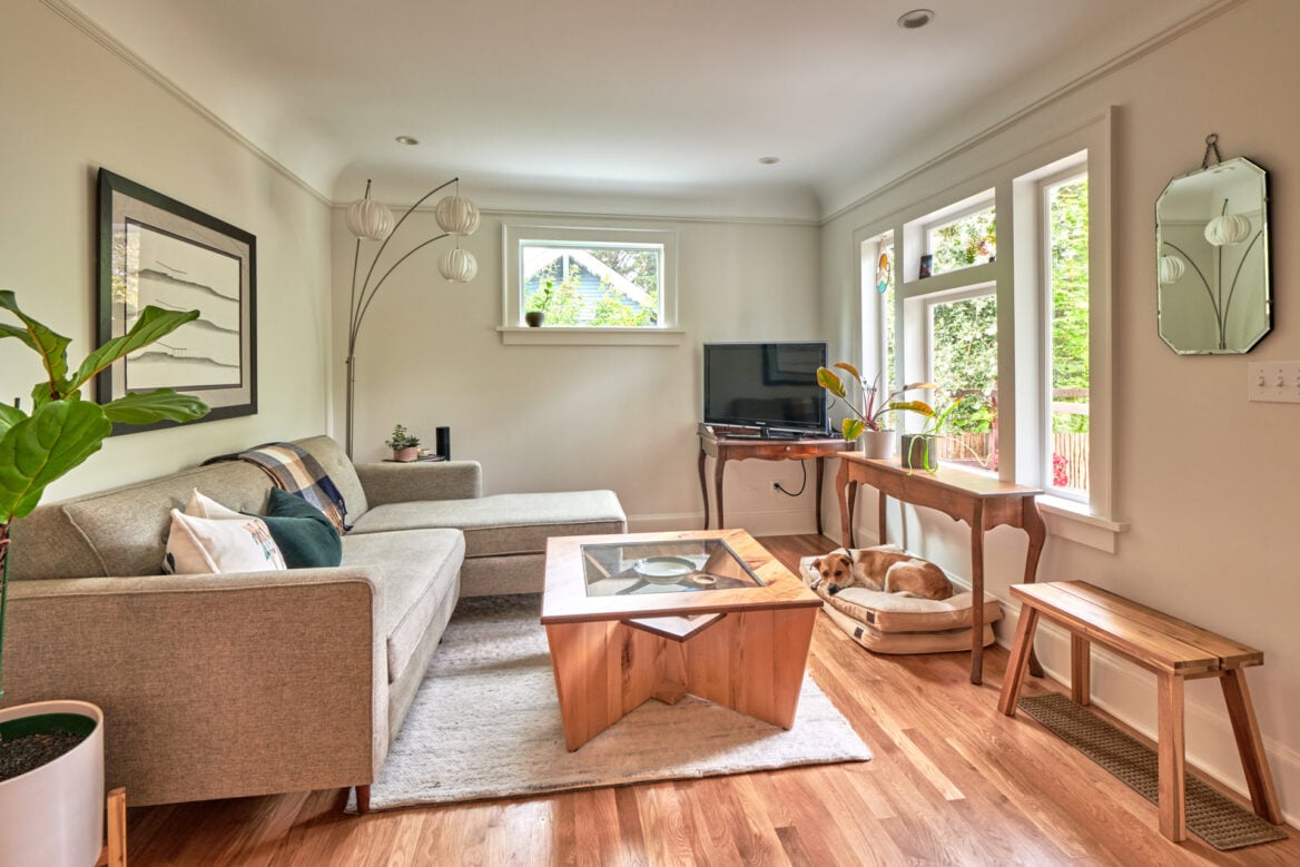 Moving up to the main level, you’ll find an expanded kitchen, a spacious dining area, a welcoming living room, and a beautifully appointed powder bathroom. The revamped kitchen now boasts twice the storage capacity and offers enough room for multiple individuals to work together comfortably. While we retained most of the original windows, we strategically added some in the kitchen to flood the space with natural light.