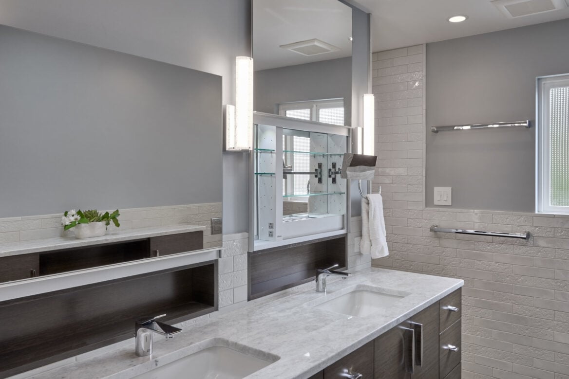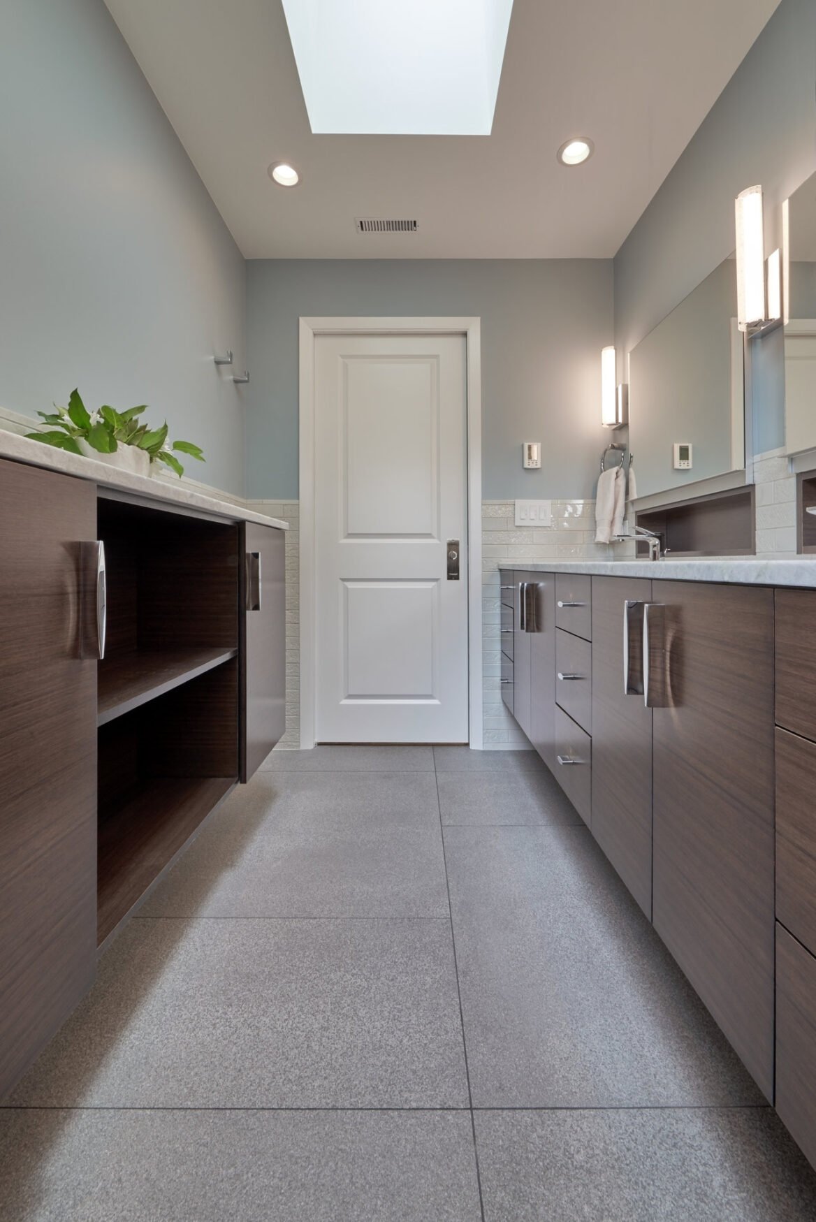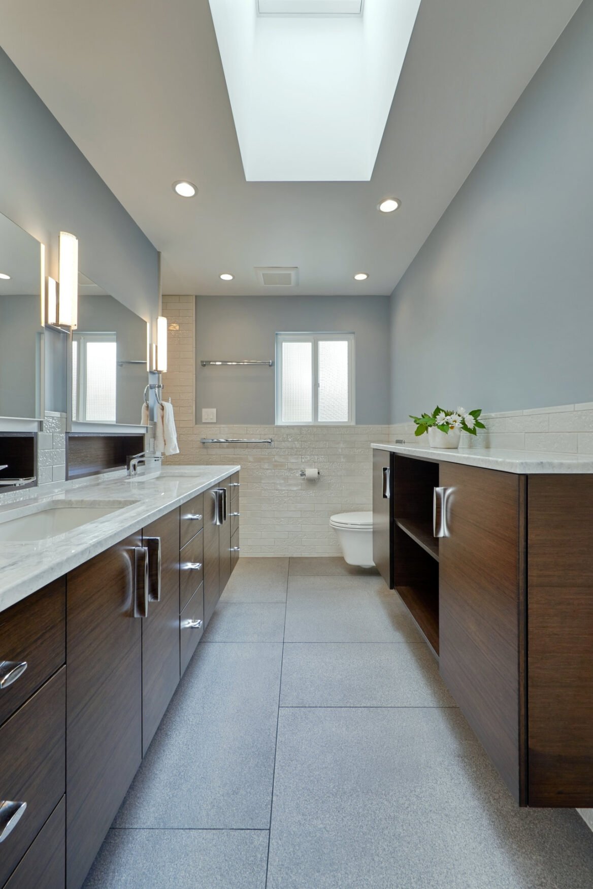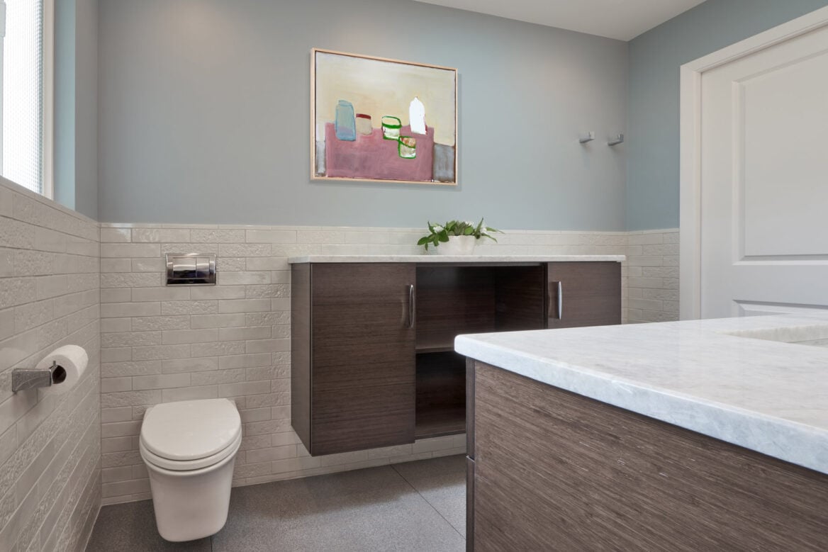 Our clients loved how their Mercer Island home was starting to come together after some recent renovations, but a major problem area remained: Their primary bedroom was cramped and dark, and their tiny en-suite bath didn’t even have a shower. It was time for an upgrade to a true master suite. CRD expanded the home to create a chic new master bedroom with access to the lushly landscaped backyard. A luxurious new primary bath gleams with a particularly high level of fit and finish, and an artfully redesigned hallway bath wows guests with its bold organic patterns.