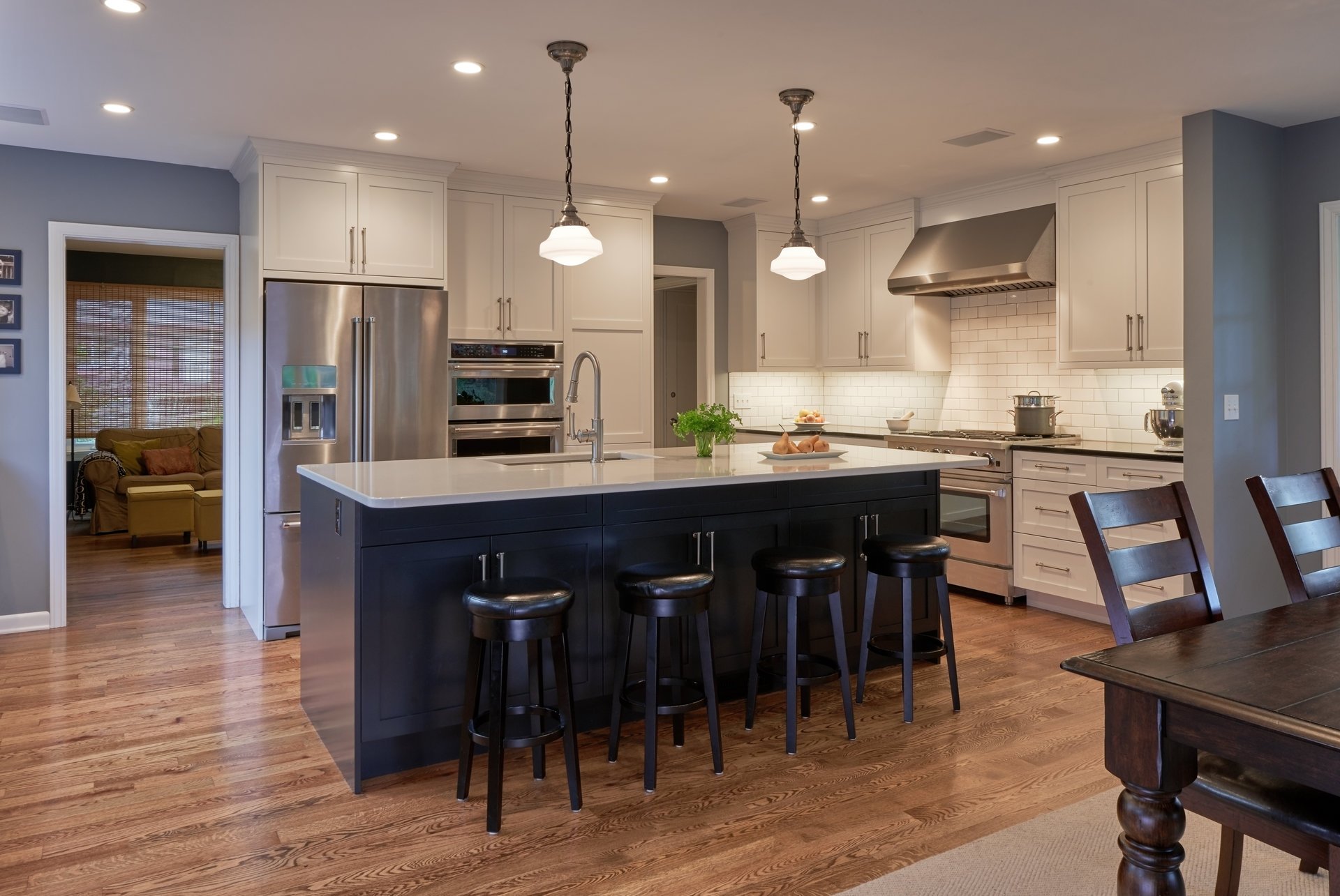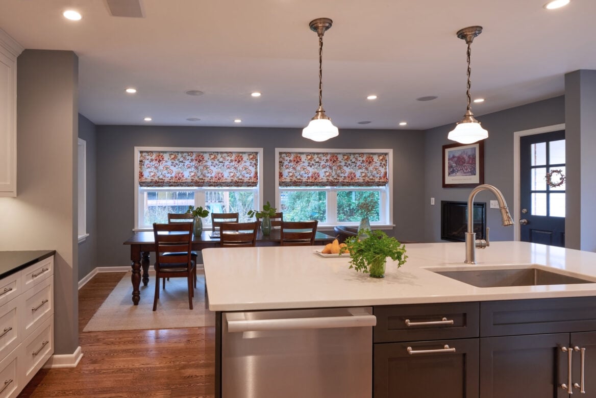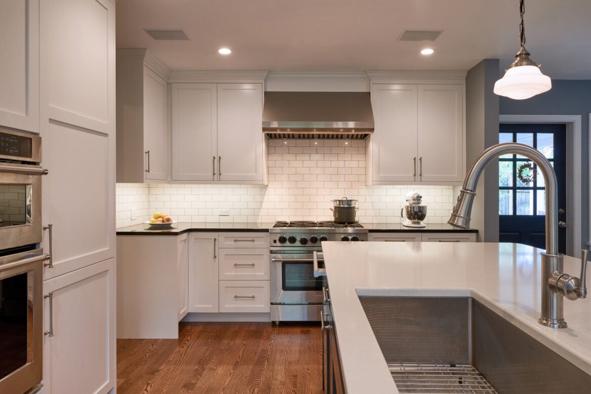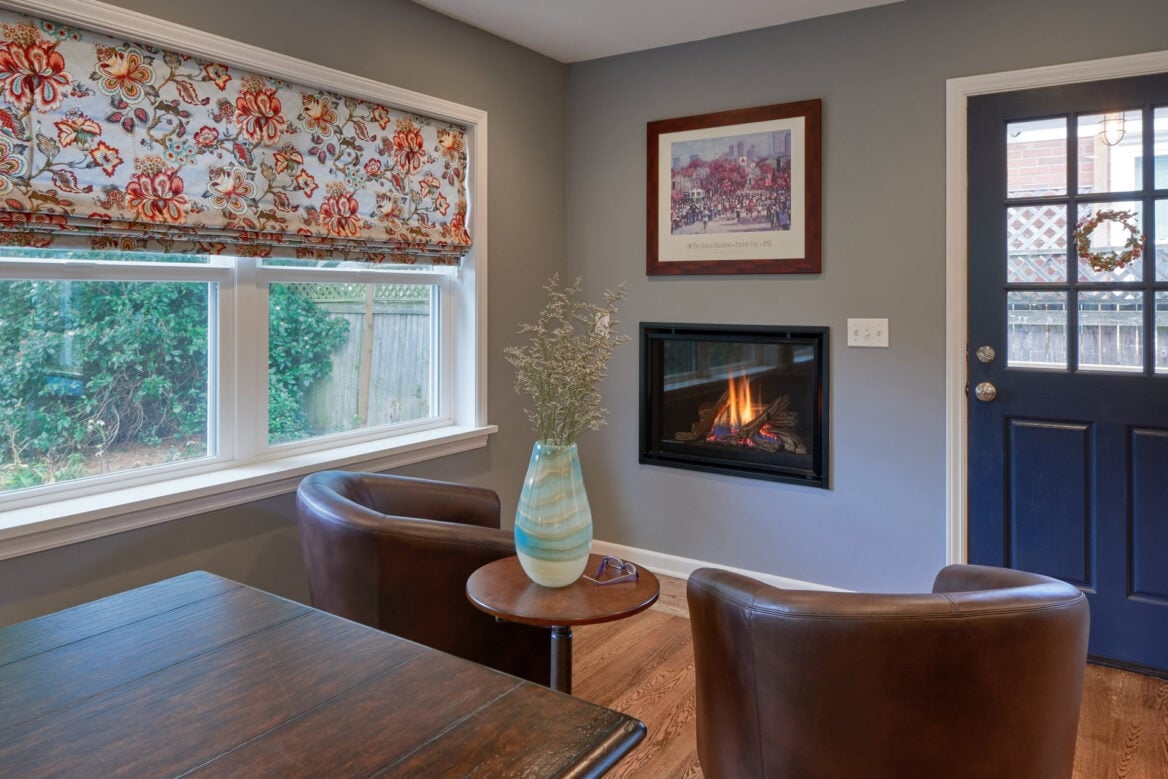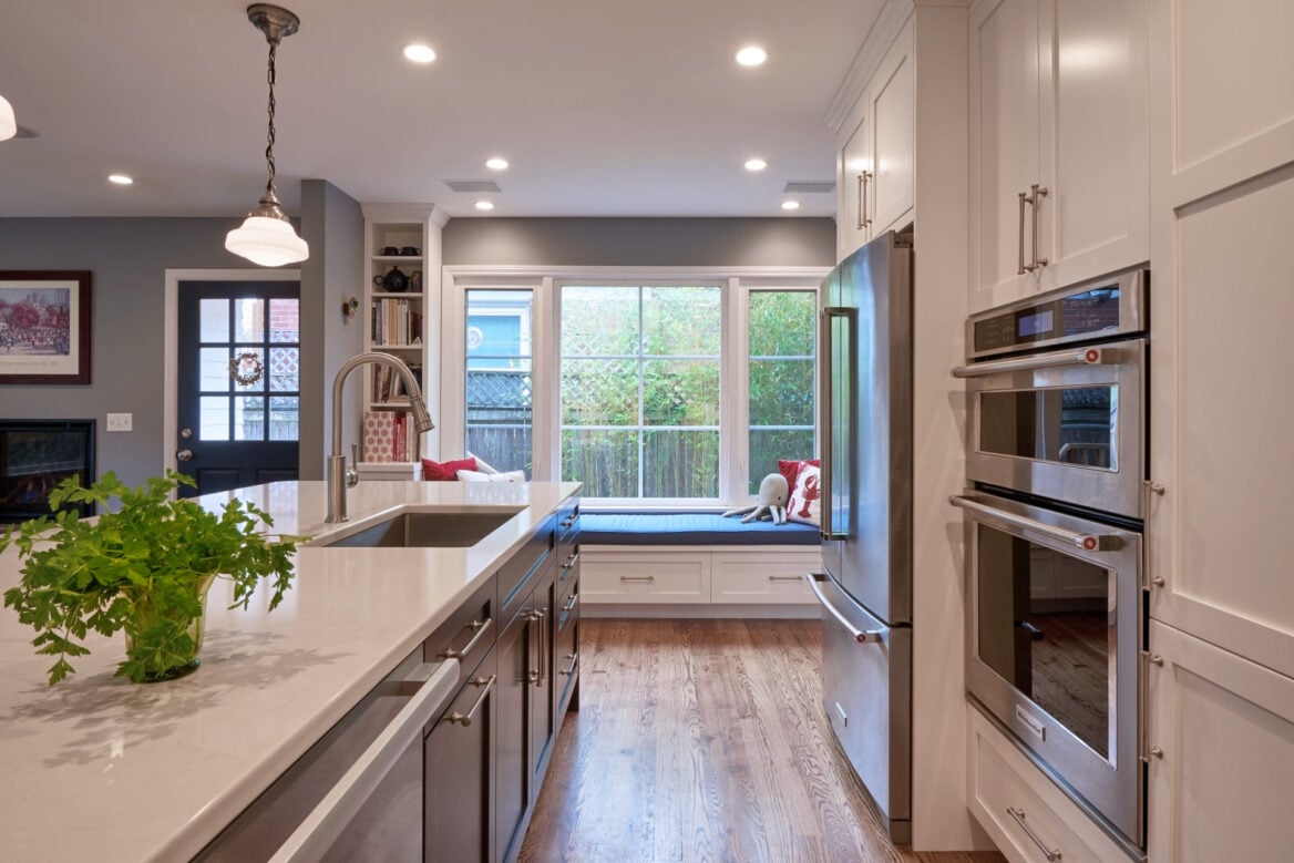 A family came to us looking to add a space for a kitchen addition that was better-suited to their lifestyle. With the idea that the kitchen is the heart/hub of the family’s daily activities, we added design elements to help incorporate best use of the space. This included adding an island for homework, a window seat, plenty of storage and quiet seating area by the fireplace. The new kitchen flows beautifully in to the dining area and creates a lovely connection to the garden beyond. Painted white, shaker cabinets and a neutral color palette combines beautifully with subtle hints of color and nautical decor elements.