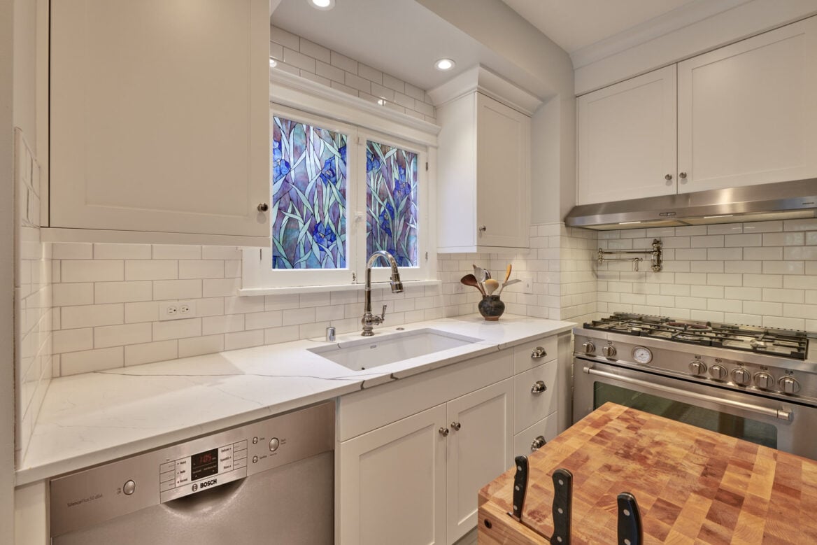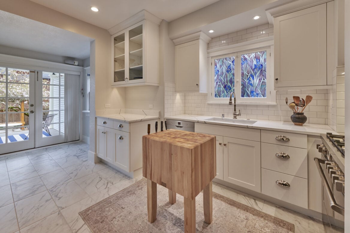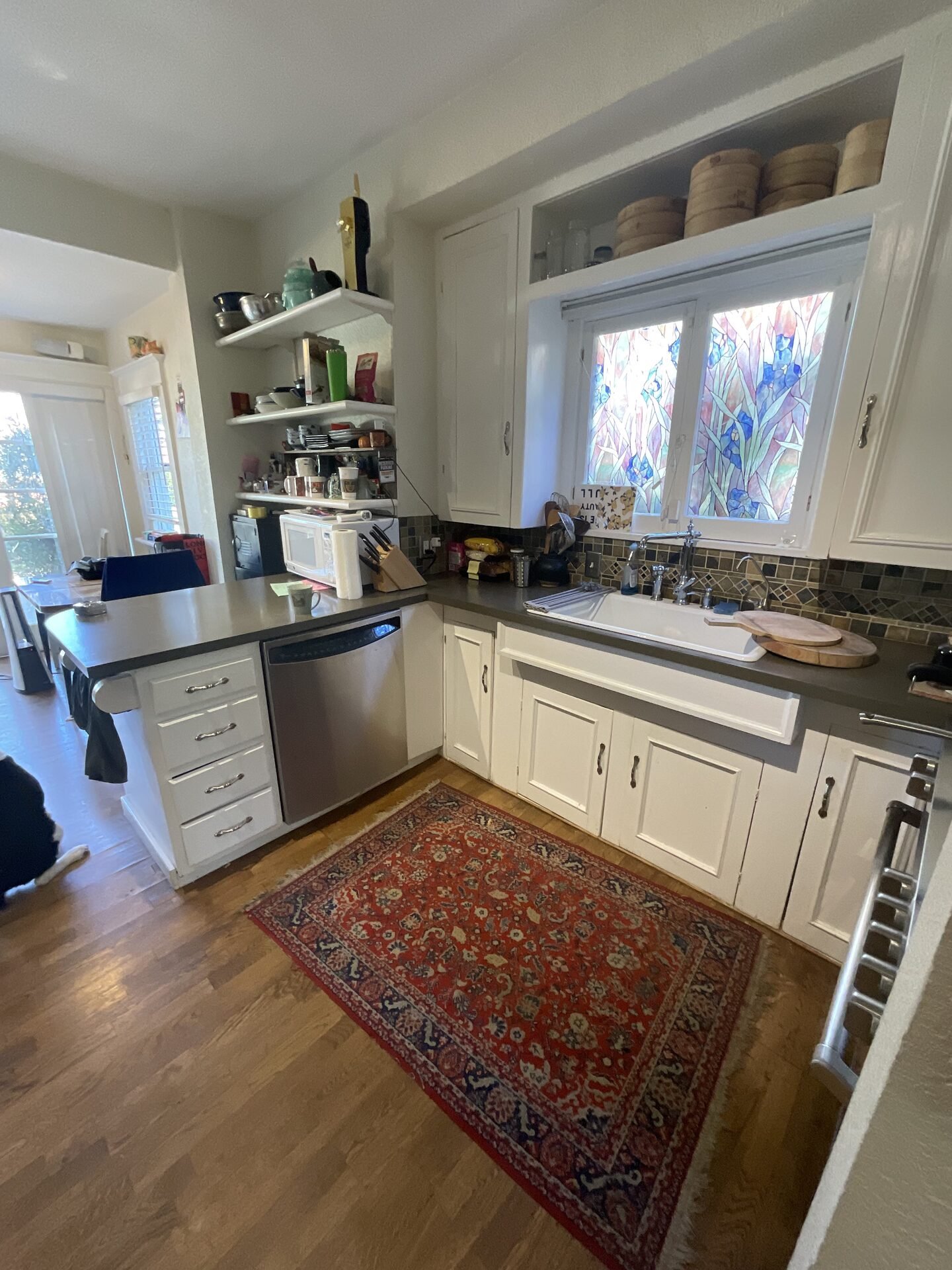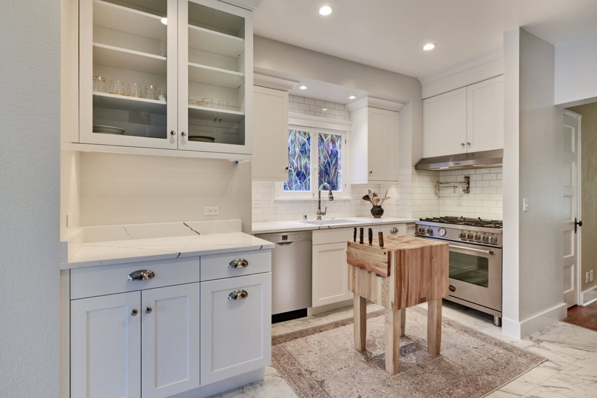 Our Home Services team renovated this entire kitchen to make it feel like a brand-new space without extended permit wait times and no structural changes. We started by demoing the entire space, including the old worn-out wood flooring that did not match the connected living room. We installed tile, and new cabinets, and changed the layout by removing the original peninsula to open up the kitchen. To increase the storage and the look of the space, we added full cabinets next to the fridge to replace the original open shelving.