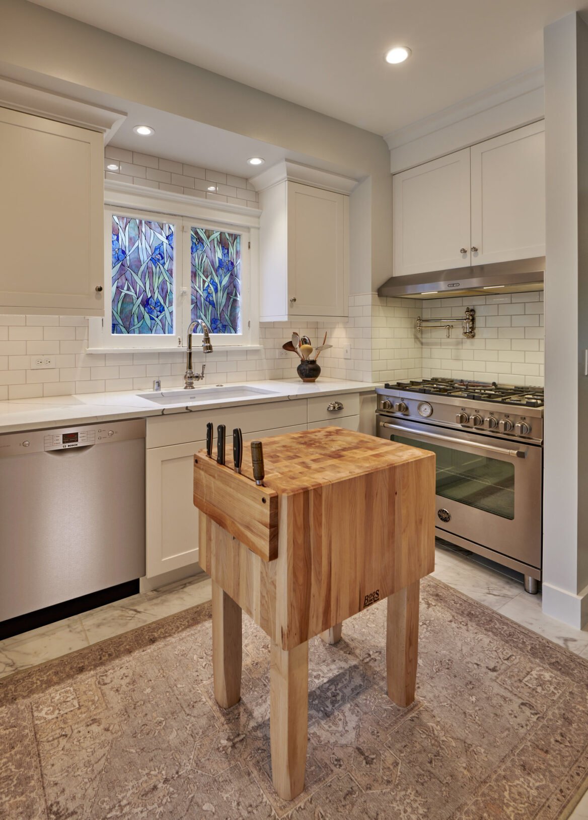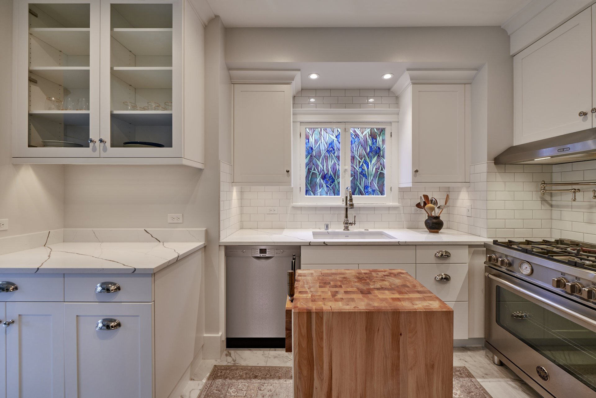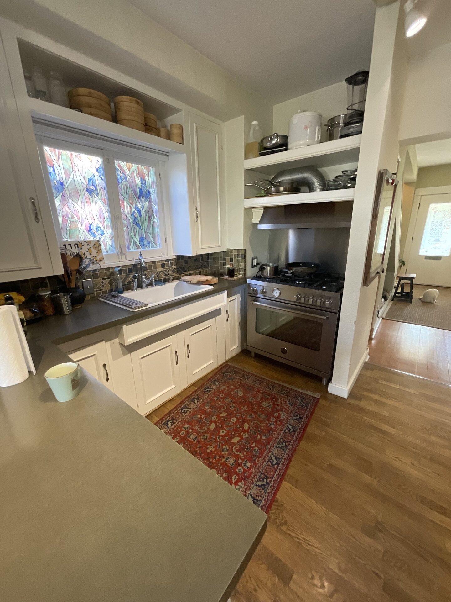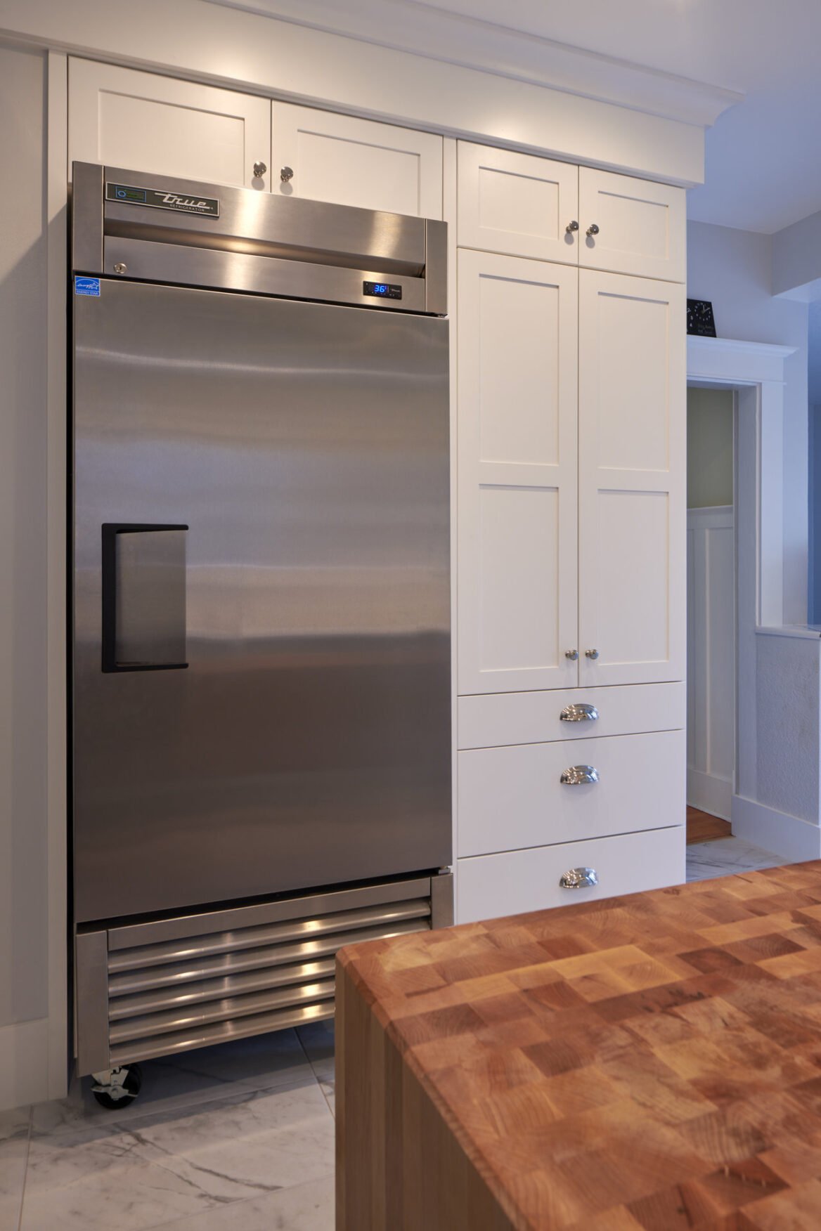 Our Home Services team renovated this entire kitchen to make it feel like a brand-new space without extended permit wait times and no structural changes. We started by demoing the entire space, including the old worn-out wood flooring that did not match the connected living room. We installed tile, and new cabinets, and changed the layout by removing the original peninsula to open up the kitchen. To increase the storage and the look of the space, we added full cabinets next to the fridge to replace the original open shelving.