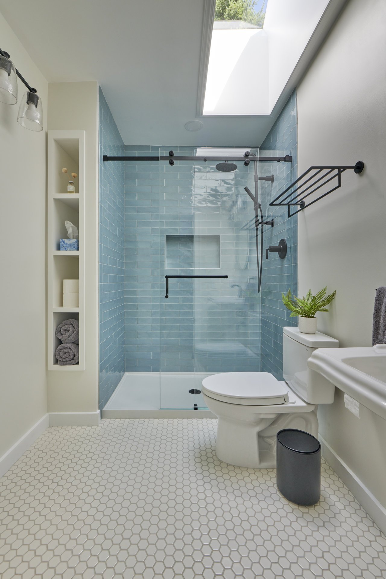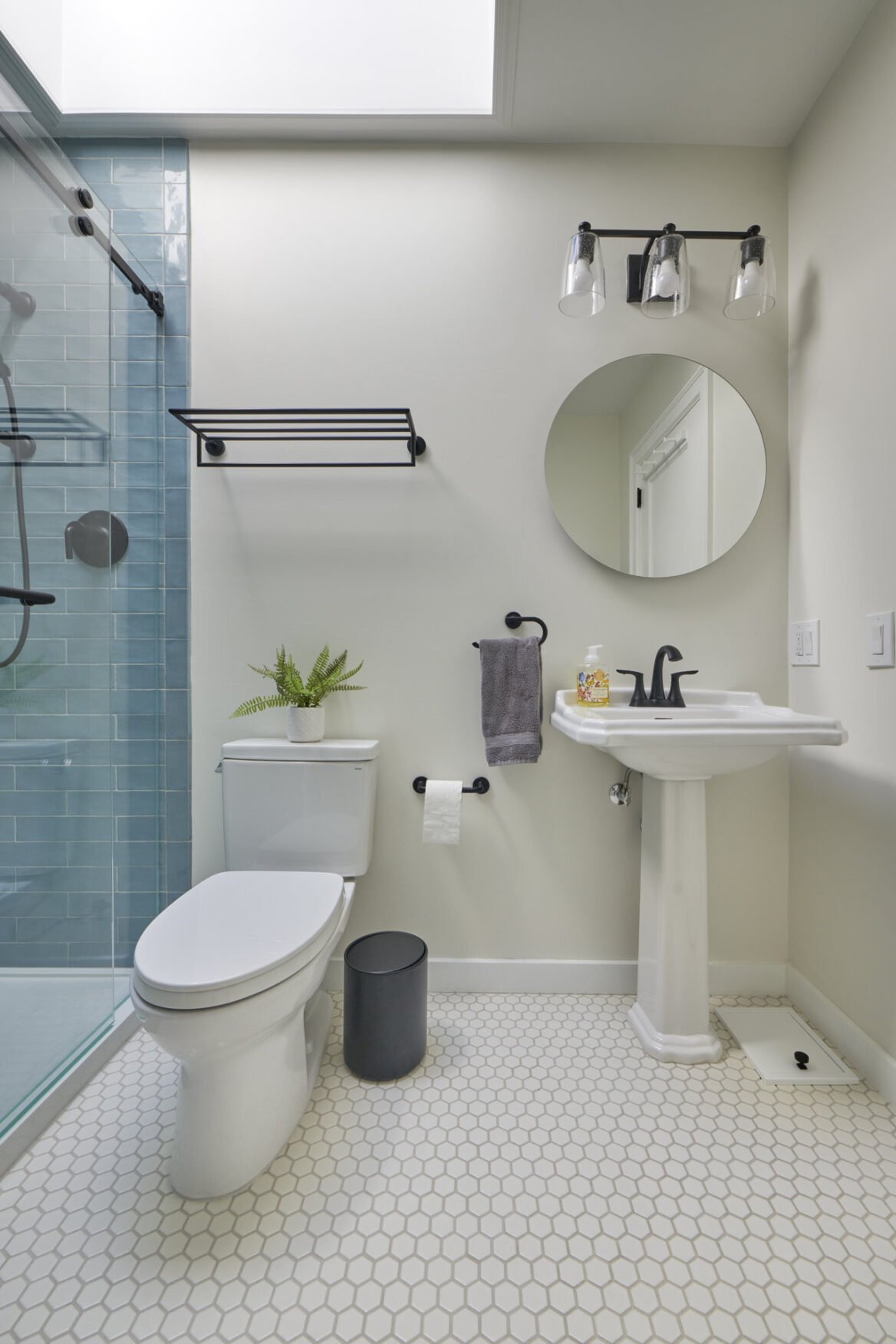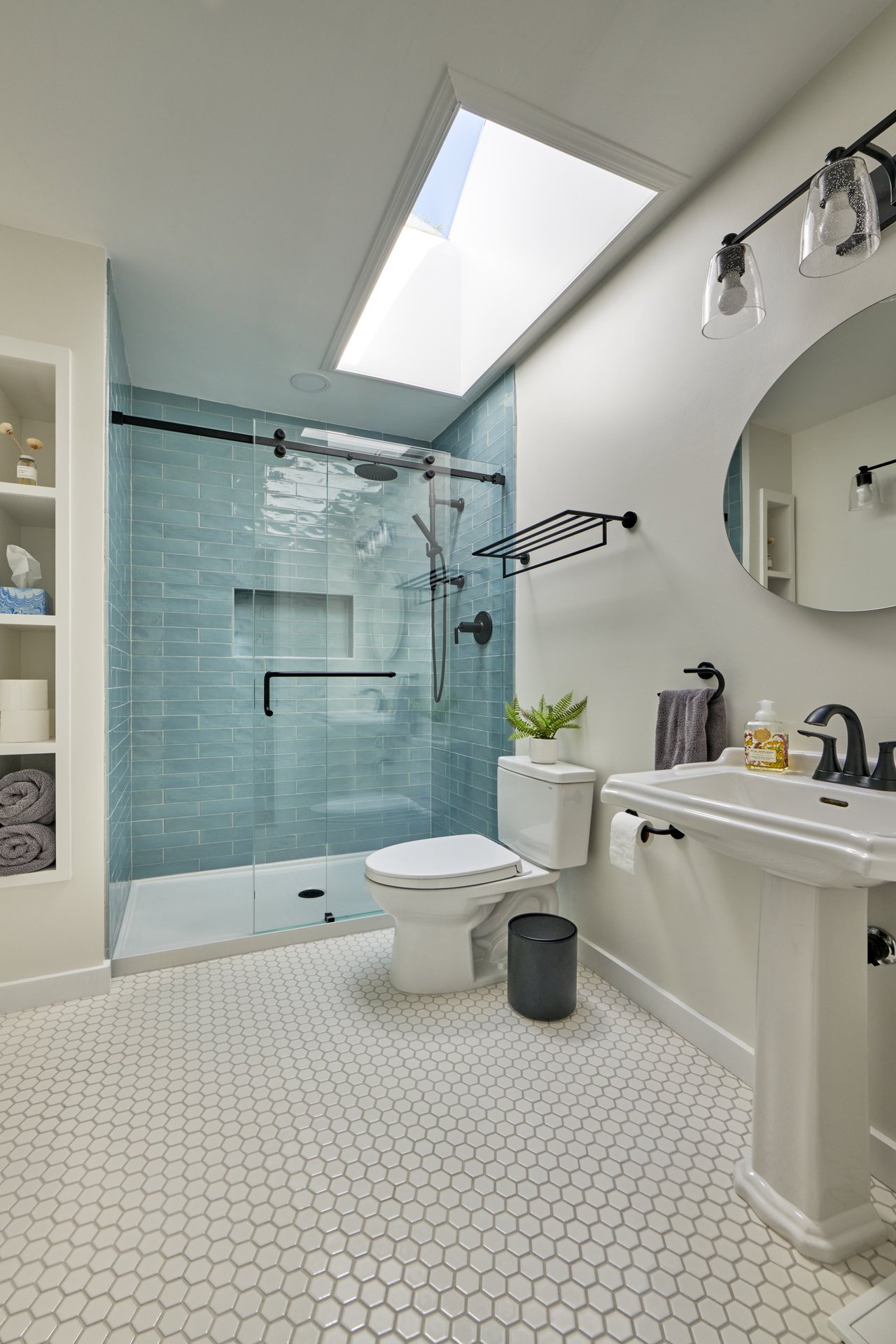 This bathroom renovation is a shining example of how a space can transform remarkably while preserving its original layout. The homeowners were particularly fond of the existing arrangement of their bathroom, appreciating its practicality and functionality. However, as tastes and design trends evolved, they wanted to infuse a fresh and contemporary style into the space. Our Home Services team came into this space and updated it to be more durable and functional while maintaining the layout. To make the space more durable, they installed tile floors/shower walls. This upgrade refreshed the space but also was a needed change from the original materials. To add more functionality, the team added built-in open shelving in the unused wall space next to the shower. These seemingly simple yet impactful updates truly transformed this bathroom.